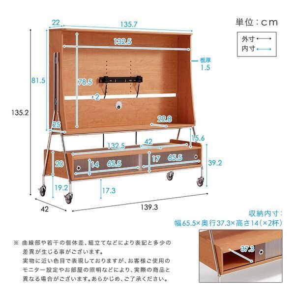 | 【カラー】 ナチュラル 【サイズ】 W139.3×D42×H135.2cm 【重量】 47.7kg 【素材】 メラミンボード ステンレススチール アルミニウム合金 強化ガラス 取っ手:PVC 【梱包】2梱包でお届けします。 2-1 サイズ:W148.5×D60×H16.5cm 2-2 サイズ:W139×D42×H19cm 合計重量:53kg 【その他】 テレビサイズをご確認の上ご購入いただきますようお願い致します。 テレビを取り付け、取り外しの際は必ず2~3人で行ってください。 【組み立て品】 お客様による組み立てが必要です。 【ご注意】 ・サイズ、重量は概算です。 ・商品カラーはご使用のモニターによって実際の明るさや色と異なって見える場合がございます。 |