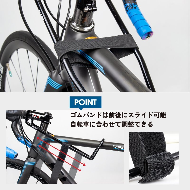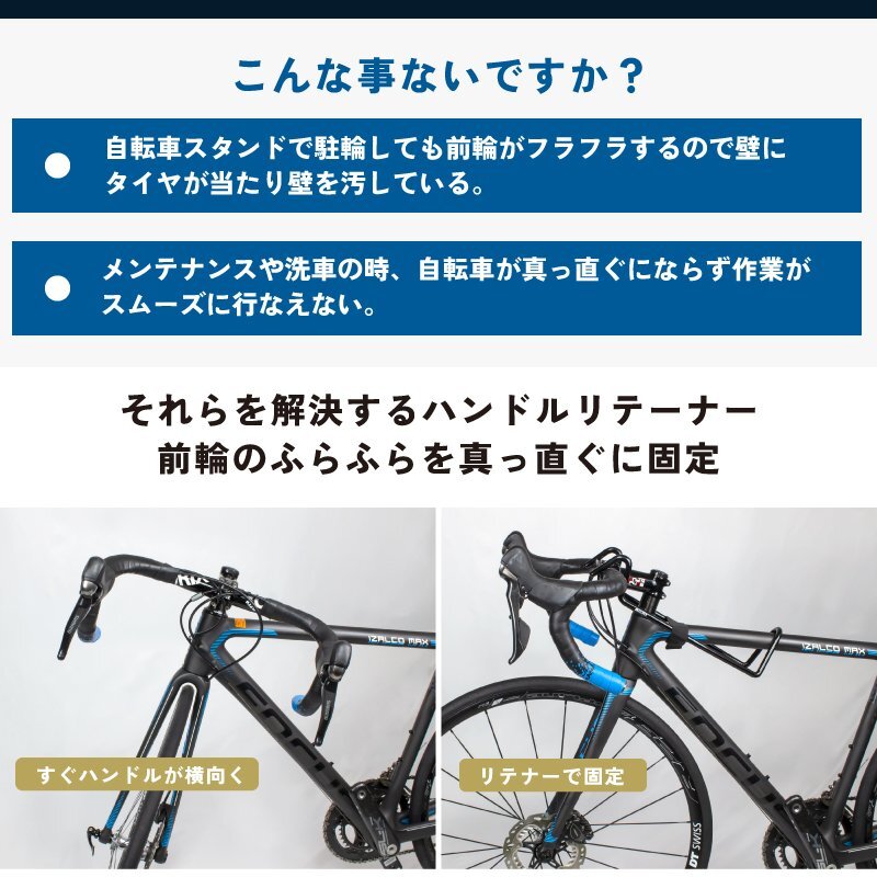 ハンドルと前輪タイヤのぐらつきを防止して真っ直ぐに固定できる便利なハンドルリテーナーです。 前輪がふらふらしないのでメンテナンスや洗車などの作業もストレスなくはかどります。 ハンドルを固定する事で作業性が向上。 後輪固定タイプの自転車スタンドで駐輪の場合にはハンドルが左右に振れてタイヤが壁にこつこつあたって壁を汚してしまう小さいストレスもハンドルを固定する事で解消します。 タイヤを真っ直ぐに出来るので綺麗に駐輪できるのもポイント。 グラつきによるストレスが減り快適に。またタイヤを外した自転車を固定するのに便利です。 装着もうすぐにできて様々なタイプの自転車に対応するので持っておいたら重宝します。 日々使うのも面倒にならない。 [傷つけない] 自転車と接する外側はPVCコーティングでハンドルやトップチューブを傷つけない。 また内側は炭素鋼素材なので強く頑丈で折れたり割れたりしない。 [ゴムバンドでロック] ゴムバンドで自転車とハンドルリテナーを固定します。 ゴムバンドは前後にスライド可能で自転車に合わせて調整できる。 [用途] メンテナンスや修理、整備や自転車保管、輸送時、自転車駐輪のサポートに。 ハンドルやフロント回りが動かない用に固定できる。 [適用自転車] ハンドル径最大径32mm、トップチューブ最大径50mmに対応。 だいたいの自転車にお使い頂けます。 商品内容ハンドルリテーナー サイズ長さ380x幅110/160mm、外径φ9mm 重量約350g 材質炭素鋼本体(径φ6mm)、表面PVCコーティング(厚み約3mm) 適用車種ハンドル径最大φ32mmやトップチューブ最大φ50mmにも対応し、ほとんどのロードバイクとMTBに使用可能です。 ・ディスプレイ環境により実物と色が異なる場合が有ります。 ・入荷時期により予告無く一部仕様変更する場合が有ります。 ・表記サイズは商品の伸びの無い寸法計測数値です。 | |