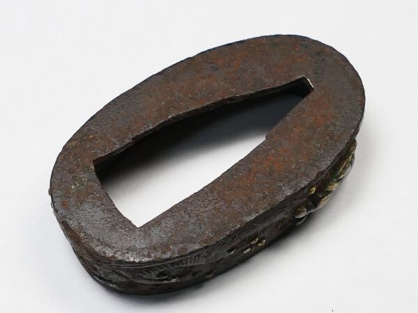 e1121a 刀装具 竹生島図 波兎 朧銀地 時代のありそうな金工縁 検:鍔 目貫 縁頭 笄 小柄