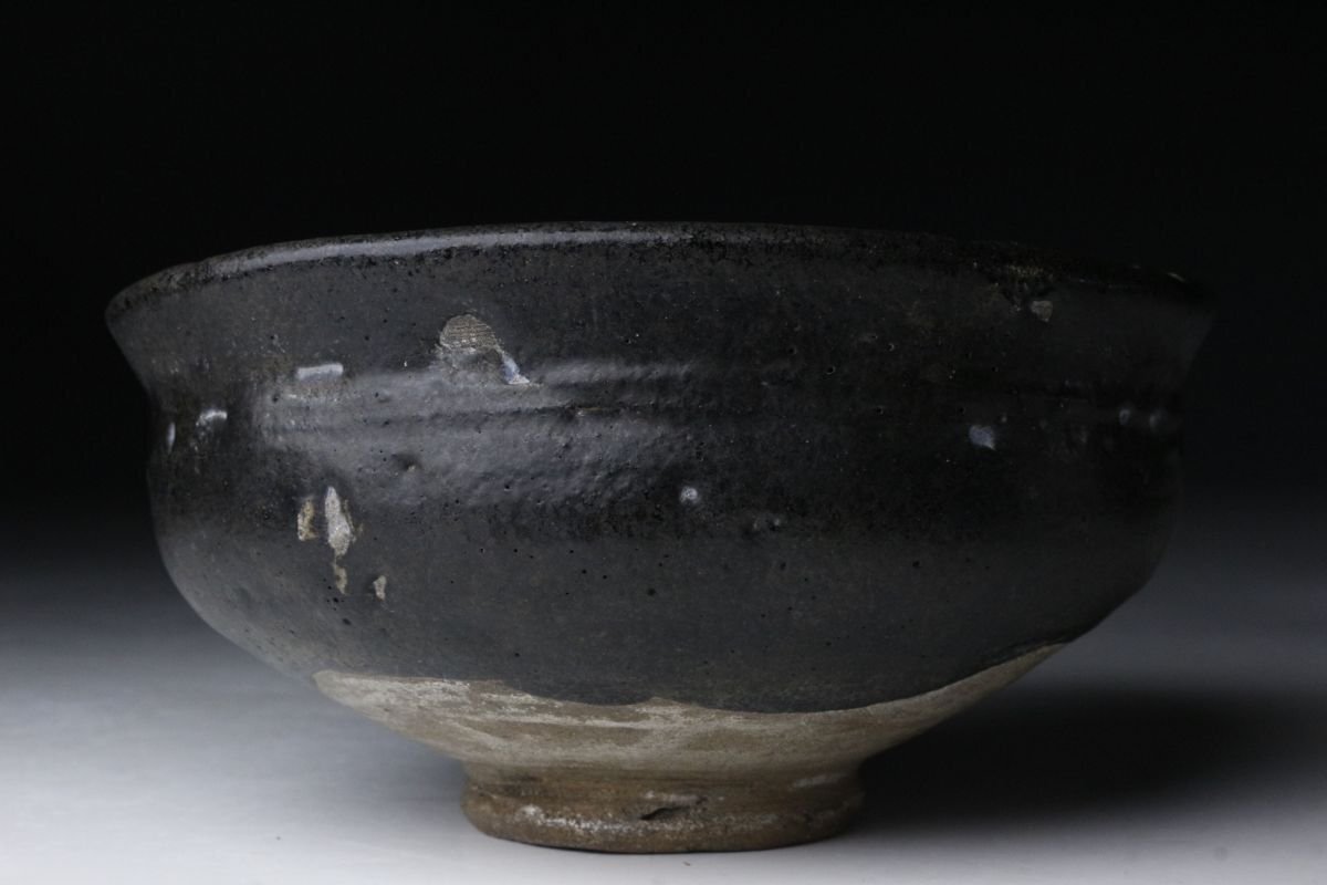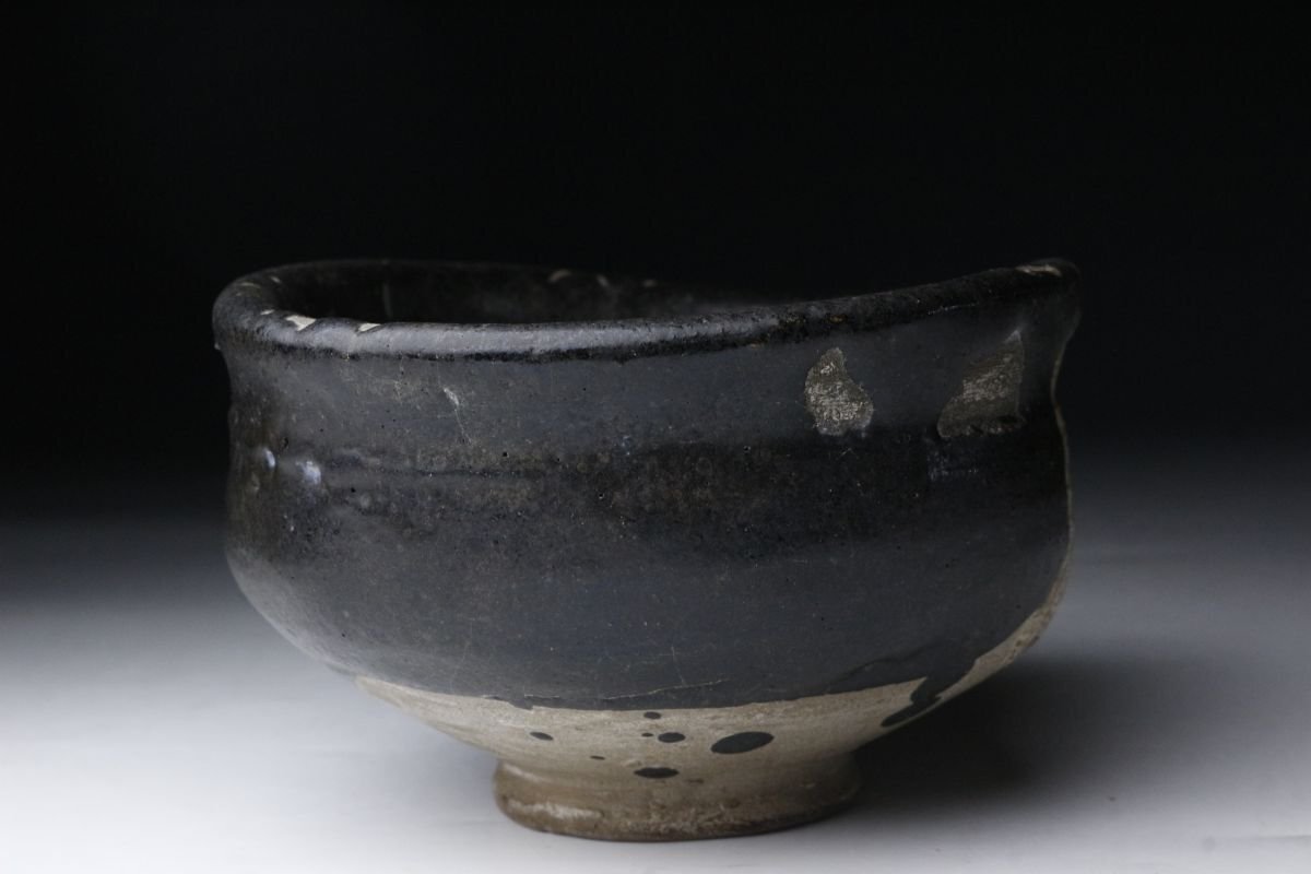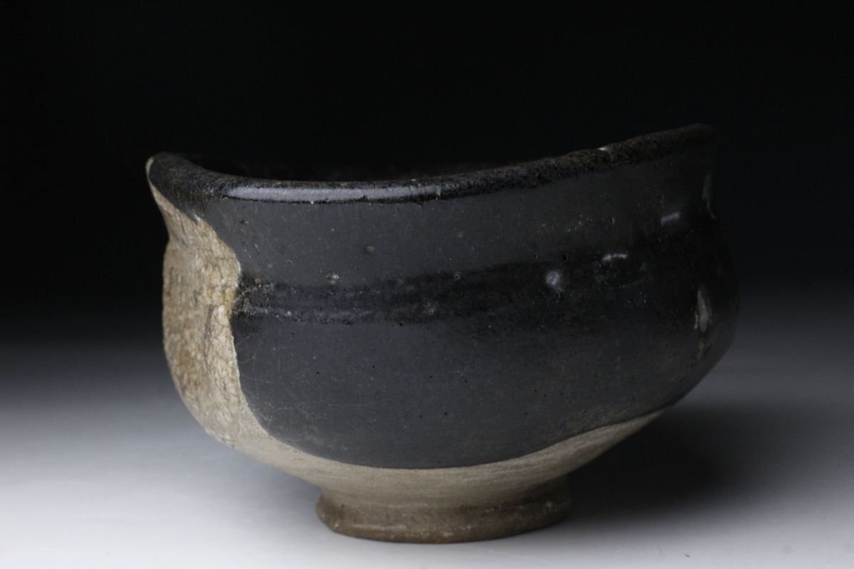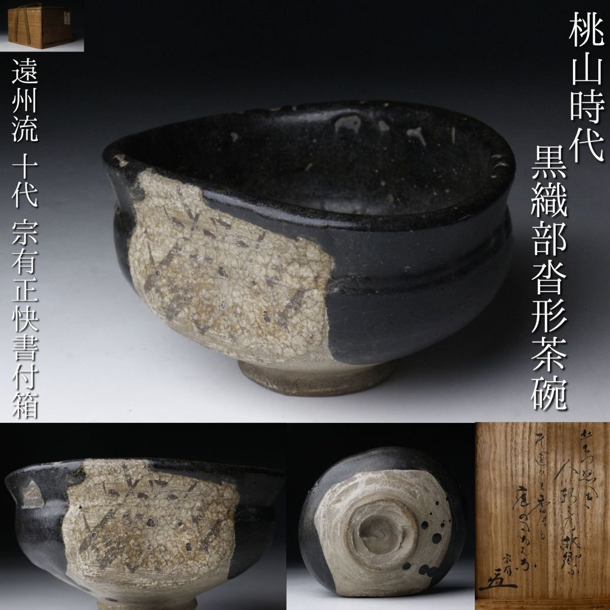 [.RO]25.07 25070546 T* * * 商品詳細 * * * ここでしか出逢うことのできない唯一の美をご紹介させて頂きます。 こちらは、桃山時代に焼成された黒織部の沓形茶碗。武家茶道の隆盛と共に花開いた“茶陶の黄金期”を象徴する、古格に満ちた名碗でございます。 堂々たる沓形の造形は、あえて均整を崩すことで生まれる「侘び」の美を体現。器面には深みある黒釉が流れ、胴部の一面には織部独特の白化粧と鉄絵が施され、抽象的な文様が静かに浮かび上がります。この黒と白の劇的な対比が、桃山茶陶における“破格の美”を雄弁に物語ります。 高台はやや低めで安定感があり、削り痕や焼き締まりに当時の土の素朴な風合いがよく残されています。器全体にみられる微細な貫入や釉の景色は、幾百年の時を経た真の古作であることを如実に示すものです。 侘び寂びの精神と、意匠の革新が交錯する織部。その中でもこの黒織部沓茶碗は、現代では極めて入手困難な茶陶の逸品として、茶会・飾り・鑑賞すべてにおいて最高の価値を持ちます。 この機会に是非お手元にてご堪能ください。 ■商品内容/ 茶碗、識箱 ■サイズ/横15.5㎝×高7.5㎝×奥行12㎝ 箱:14横㎝×高11㎝×奥行17㎝ ■状態/ 経年によるスレ、傷、汚れ 箱にスレ、傷、汚れ、紐のちぎれがございます。 ※写真にてご確認、ご了承の上ご入札下さい。