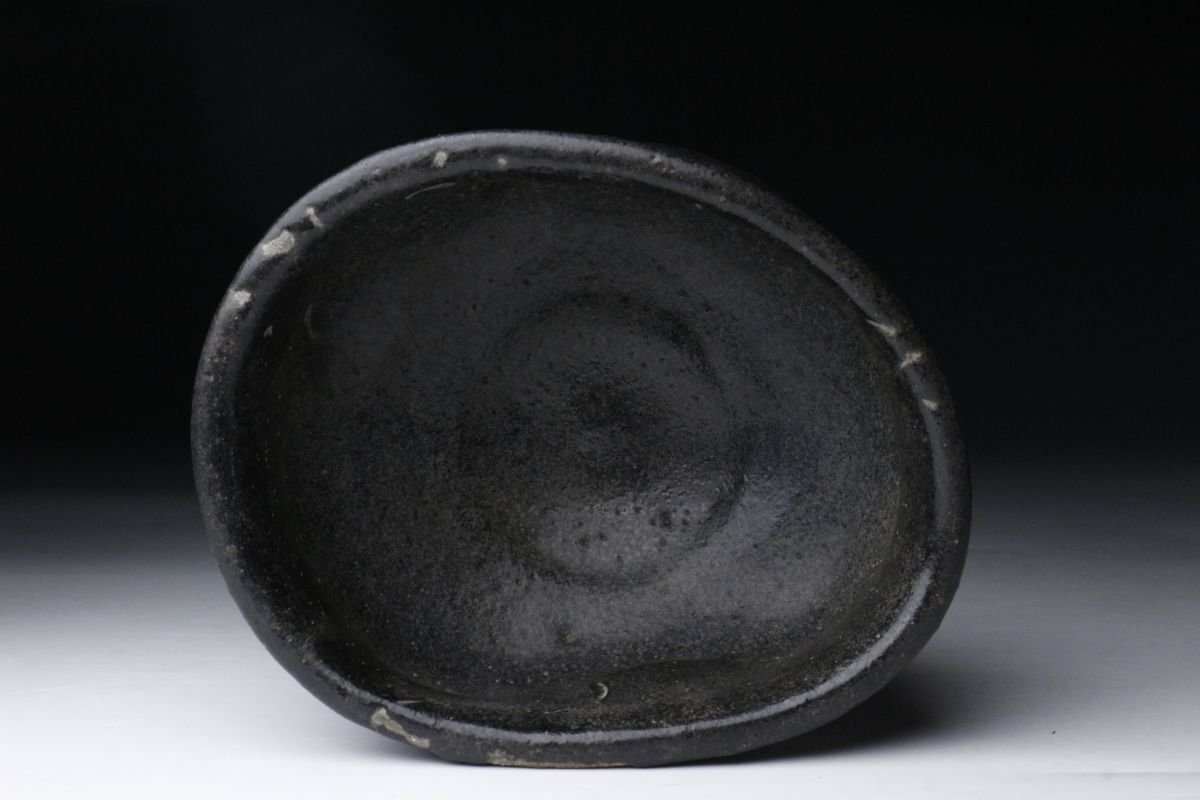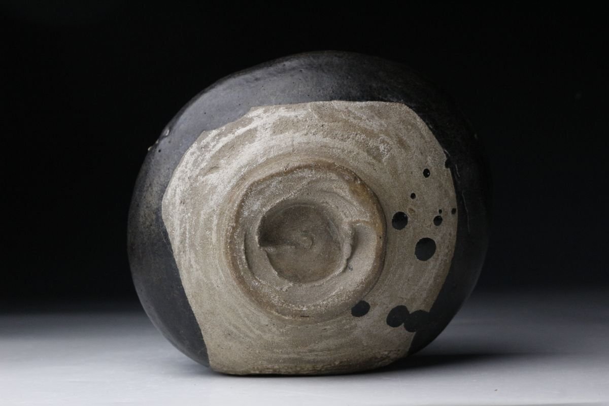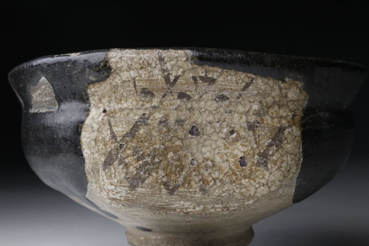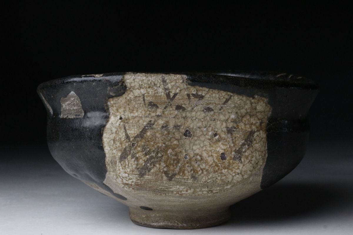 [.RO]25.07 25070546 T* * * 商品詳細 * * * ここでしか出逢うことのできない唯一の美をご紹介させて頂きます。 こちらは、桃山時代に焼成された黒織部の沓形茶碗。武家茶道の隆盛と共に花開いた“茶陶の黄金期”を象徴する、古格に満ちた名碗でございます。 堂々たる沓形の造形は、あえて均整を崩すことで生まれる「侘び」の美を体現。器面には深みある黒釉が流れ、胴部の一面には織部独特の白化粧と鉄絵が施され、抽象的な文様が静かに浮かび上がります。この黒と白の劇的な対比が、桃山茶陶における“破格の美”を雄弁に物語ります。 高台はやや低めで安定感があり、削り痕や焼き締まりに当時の土の素朴な風合いがよく残されています。器全体にみられる微細な貫入や釉の景色は、幾百年の時を経た真の古作であることを如実に示すものです。 侘び寂びの精神と、意匠の革新が交錯する織部。その中でもこの黒織部沓茶碗は、現代では極めて入手困難な茶陶の逸品として、茶会・飾り・鑑賞すべてにおいて最高の価値を持ちます。 この機会に是非お手元にてご堪能ください。 ■商品内容/ 茶碗、識箱 ■サイズ/横15.5㎝×高7.5㎝×奥行12㎝ 箱:14横㎝×高11㎝×奥行17㎝ ■状態/ 経年によるスレ、傷、汚れ 箱にスレ、傷、汚れ、紐のちぎれがございます。 ※写真にてご確認、ご了承の上ご入札下さい。