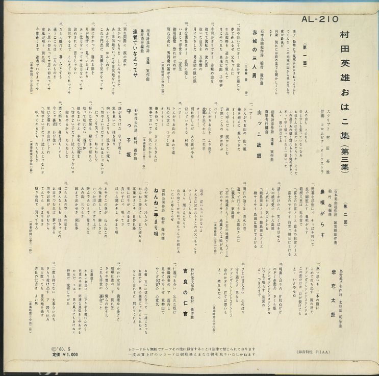 A00453575/10インチ/村田英雄「おはこ集(第三集)(1960年・AL-210)」 [浏览原始页面]