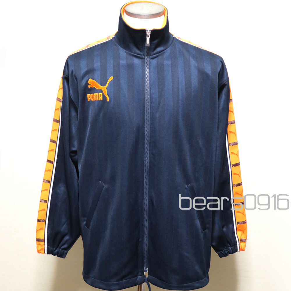日本正規 USED美品 PUMA プーマ ZIPアップ トラックジャケット 濃紺シャドーストライプ×オレンジ ロゴ側章 胸ロゴ刺繍 バックデカロゴプリント S-Mサイズです。