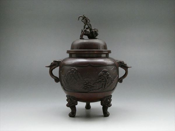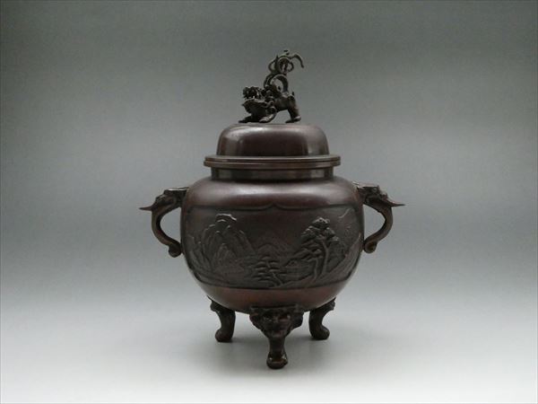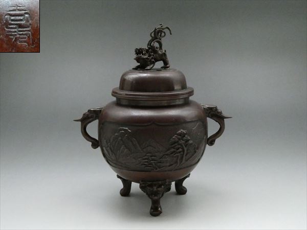 | ★商品★ ・香炉【楼閣山水文香炉】 ★銘★ ・吉秀 ★寸法★ ・高さ (約)19cm ※蓋部分を含む ・胴径 (約)11.5cm ※突起部分を除く ・口径 (約)7.5cm ★重量★ ・(約)1271g ★材質★ ・銅製 ★状態★ ・経年による傷、汚れ、変色が見られます。 ※備考※ 商品状態に関しては、あくまでも当方の見立てとなります。 程度には個人差がございますので、商品画像を良くご覧になられた上でのご入札お待ちしております。 |