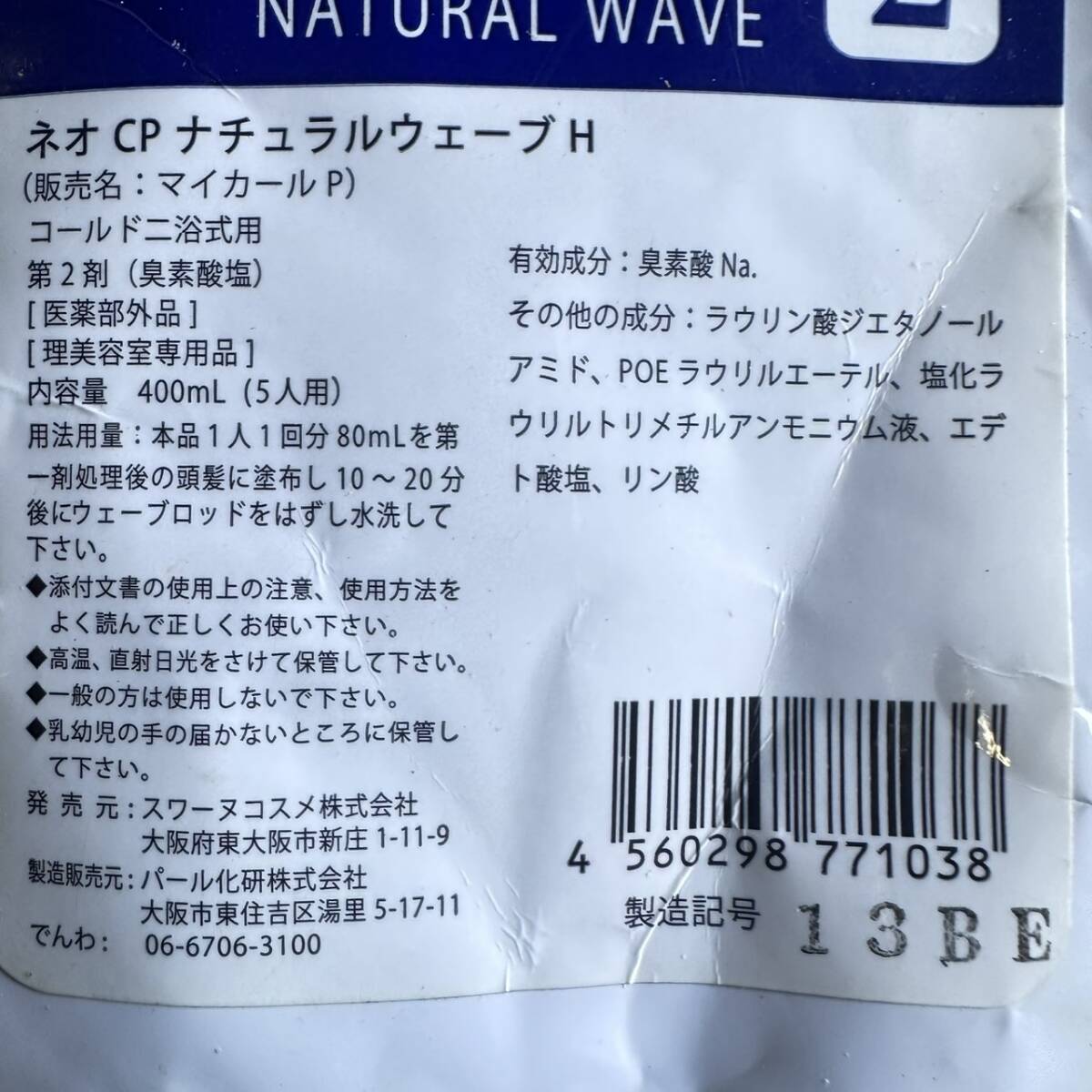 ネオ CP ナチュラルウェーブ H パーマ剤【第2剤】 400ml×7 まとめ売り 【医薬部外品】:定められた有効成分と効果・効能を持つ医薬部外品として製造されています。 有効成分(臭素酸ナトリウム ):ウェーブをしっかりと固定・定着させ、理想のスタイルを長持ちさせます。 理美容室専用品:プロの技術者による施術を前提とした、業務用処方です。 内容量: 400ml 目安: 約5人分(1人1回80mlを使用した場合) 第1剤処理後の頭髪に、本品(第2剤)を塗布します。 10分~20分 放置してください。 ウェーブロッドをはずし、丁寧に水洗してください。 【重要】 ご使用前には、必ず製品添付の使用上の注意と使用方法を熟読し、安全かつ正しくお使いください。 ?? 成分表美しい仕上がりをサポートするその他の成分:ラウリン酸ジエタノールアミド、 POEラウリルエーテル、塩化ラウリルトリメチルアンモニウム液、エデト酸塩、リン酸 【新品・未使用】 アウトレット 保管品につき何卒よろしくお願い申し上げます。 | ||||