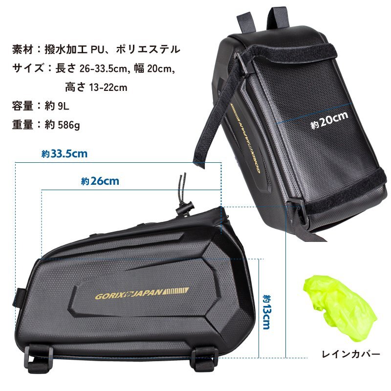 GORIX Mayaキャリアバッグ 凹凸立体的なデザインで本体はハードシェルで頑丈で衝撃吸収性が高い素材を採用。 バッグ表面には撥水性を持たせ、ジッパーは止水ファスナーを採用。 またレインカバー付属で急な雨にも対応します。 9Lの容量は水筒や着替え、弁当や折りたたみ傘など実用的な荷物を収納できる大容量モデル。 ツーリングだけではなく自転車通勤など日々のサイクルライフに最適なキャリアバッグです。 ロードバイクからクロスバイク、MTB、折畳自転車、ミニベロまで様々な自転車で使える自転車用リアバッグキャリアに取付けてお使い頂けます。 背中に荷物を背負わなくていいのでとても便利。 FEATURES ・大容量の9L(水筒や着替え折りたたみ傘など収納可能サイズ) ・防水機能、バッグ表面は撥水加工に加えて付属にレインカバー、防水シップ採用 ・バッグ内の両サイドにメッシュポケット完備 ・ハードシェルで頑丈なバッグは衝撃に強い ・見た目はエンボス加工で立体的 ・ダブルジッパーで開閉しやすい ・持ち運びしやすい手持ちベルト ・弾力紐コードはプラスで荷物を固定できる [バッグ内] バッグのジッパーは大きく開き中身の確認や取出し、収納がしやすくなっています。 両サイドにメッシュポケット完備で小物などの見失いやすい物はサイドに収納ができる。 また中身はクッション性があり衝撃を受けても中身を守ります。 [バッグ外側] 固めのハードシェルで頑丈に仕上がっています。 立体的なデザインはかっこよくボックス感が漂っています。 撥水加工で水を弾きます。汚れも拭き取り易い。 [装着] 前2本と下2本のベロクロでリアキャリに装着します。 商品内容自転車用リアバッグ、レインカバー 素材撥水加工PU、ポリエステル サイズ長さ26-33.5cm, 幅20cm, 高さ13-22cm 容量約9L 重量約586g ※完全防水ではございません。 | |