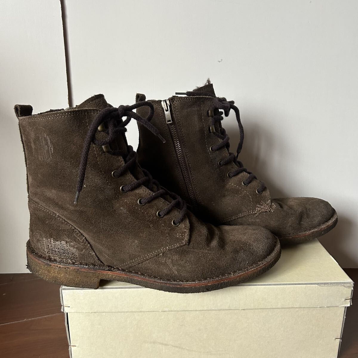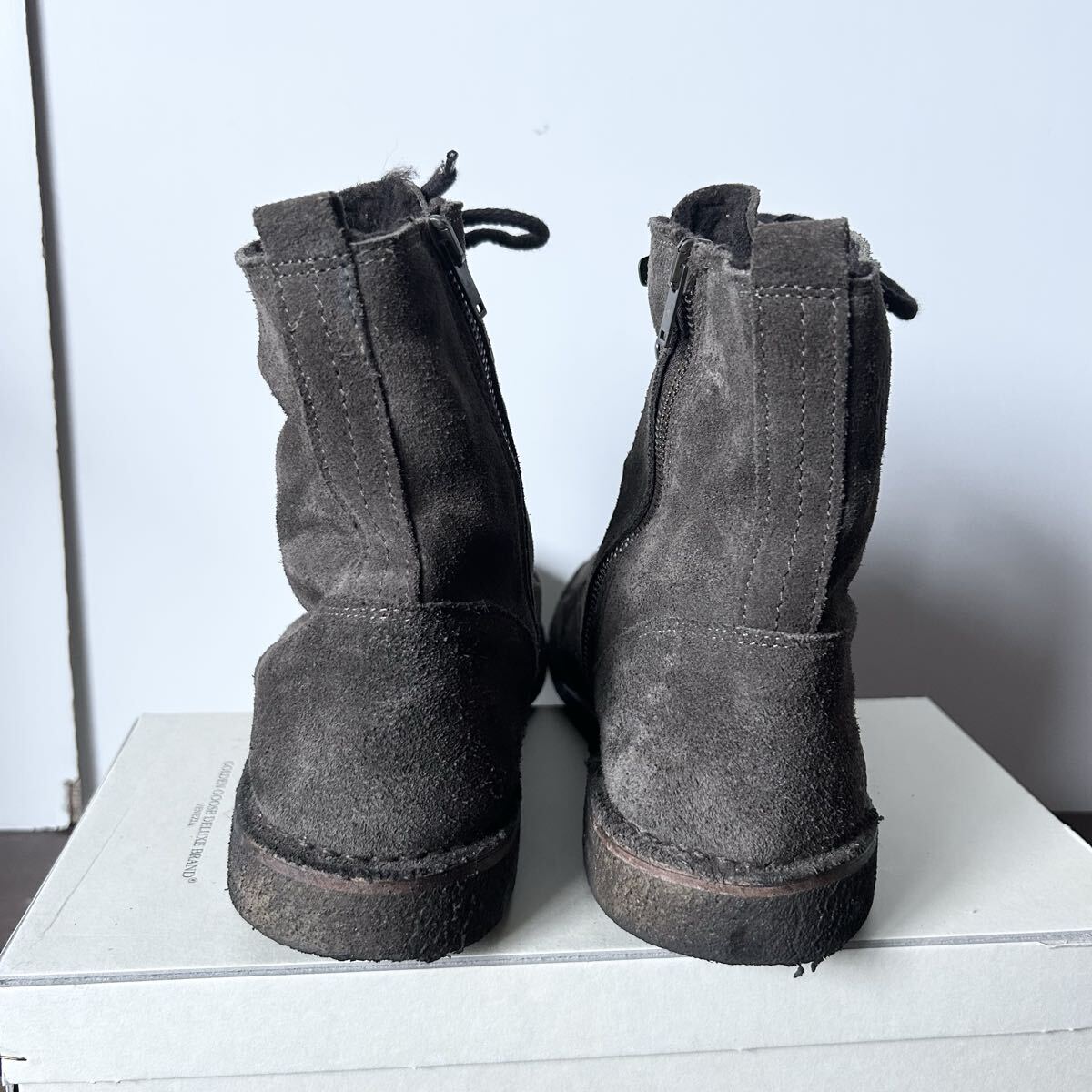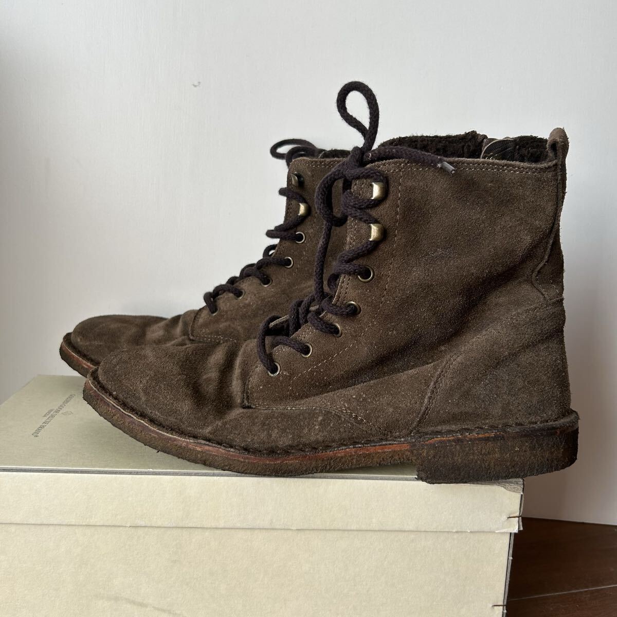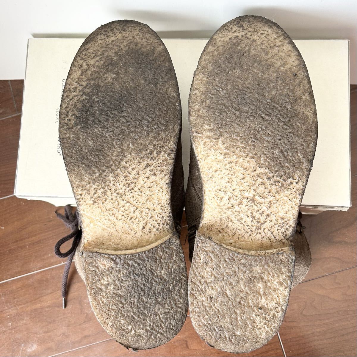 全体的に若干の使用感はございます。 右足かかと付近と左足トゥのシワ部分に補修跡があります。(写真参考) クレープソールの為、多少汚れはありますが減りなどはさほどなく、まだまだ履いていただけます。箱あり。 |