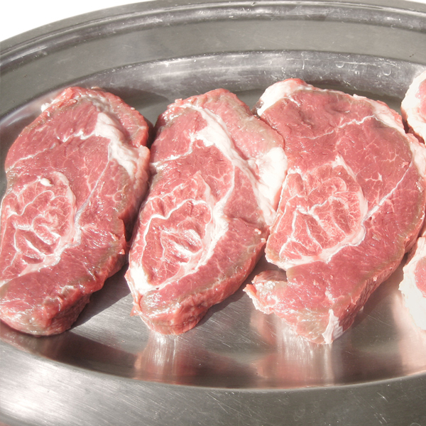真空パック内の肉色が悪いように見える=悪い肉ではありません。 精肉の鮮やかな紅色は、筋肉色素(ミオグロビン)が空気中の酸素に触れる事により発生します。真空パックは空気に触れていないため、その現象が起きないのです。スーパー等で売られているスライスのお肉の重なった部分の発色が悪いように見える事も、この現象によるものです。真空パックの精肉は真空処理のため一時的に肉色が変化しておりますが、開封後15分程度空気に触れることで元の肉色に戻ります。 |