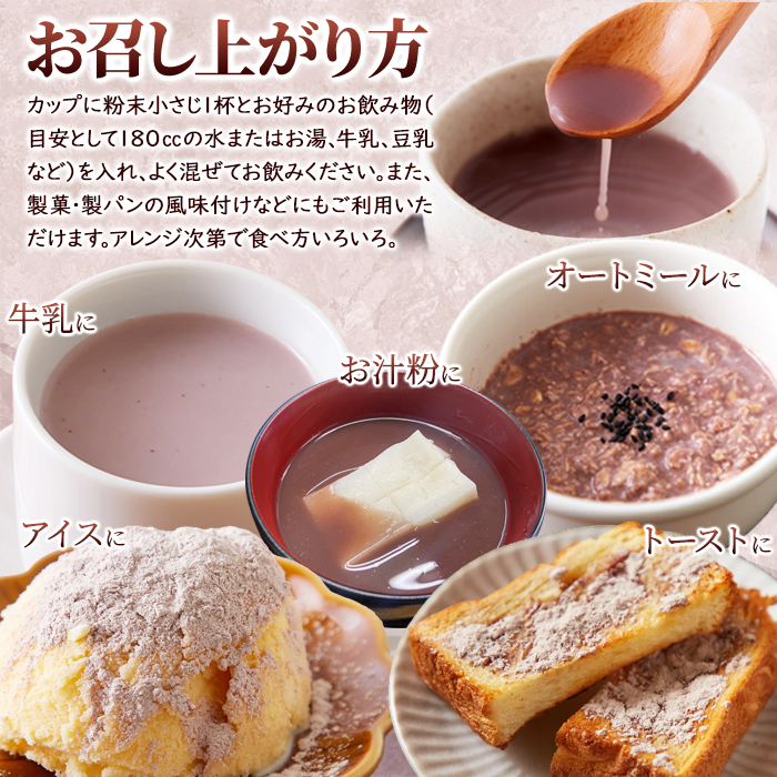 | カップに粉末小さじ1杯とお好みの飲み物(目安として180ccの水またはお湯、牛乳、豆乳など)を入れ、よく溶かしてお飲みください。 また、製菓・製パンの風味付け材料や、アイスクリーム、ヨーグルトなどの乳製品と合わせたり、バタートーストに振りかけるなど幅広くご利用できます。 ●本製品製造工場では大豆・小麦を含む製品を製造しております。 ●品質保持のため、脱酸素剤が入っておりますので、開封後は捨ててください。 ●開封後はチャックをしっかりと閉め、冷蔵庫で保存してください。 ●ご使用時には乾いた清潔なスプーンをお使いください。 ●賞味期限は未開封で保存したときに品質が保たれる期限です。開封後はお早めにお召し上がりください。 ●原料由来により色合いや風味が多少違うこともありますが、品質には問題ございません。 |