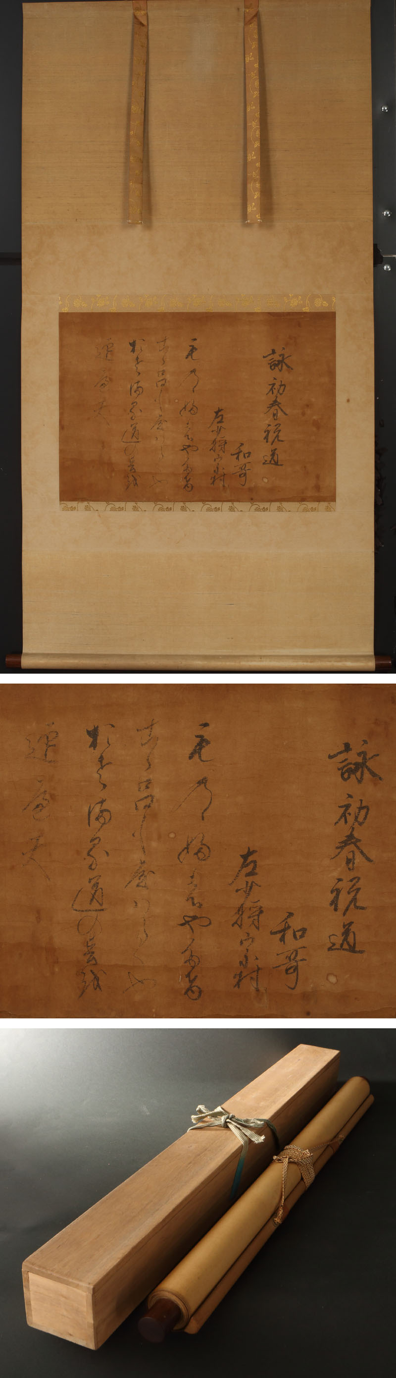 伊達宗村の和歌詠草です。 「初春祝道」を題に、「ものゝふの弥猛心(やたけこゝろ)もやはらぐや おさまる道の春を迎へて」と詠んでおります。宗村が少将成 を果たした享保20(1735)年から中将に昇った延享4(1747)年の間、18~30歳の作と考えられます。 宗村は父・吉村より文学的素養を受継ぎながら、馬術、槍術、剣術、軍術、砲術にも精通していた智勇兼備の人物として知られます。質素倹約に努めたほか、延享4(1747)年、肥後熊本藩主細川宗村が人違いから襲撃され横死した際も、咄嗟の機転を利かせ熊本藩が無嗣断絶となる所を回避するなど、殿中の狼藉に冷静に対処したその功績は計り知れぬものがあります。 伊達家中興の英主の豊かな詩情と武士としての矜持が感ぜられる逸品です。 ◆伊達宗村 江戸中期の大名。伊達吉村の4男。寛保3(1743)年陸奥仙台藩主伊達家6代。和歌をこのみ「花影集」をのこす。宝暦6(1756)年没、39歳。初名は久村。 〔本文〕 詠初春祝道 和歌 左少将宗村 ものゝふのやたけ こゝろもやはらくや おさまる道の春を 迎へて 付属:時代箱が付属します。 寸法:縦125cm、横66cm(最大幅。若干の誤差はご了承下さい) 状態:経年のヤケ・イタミがございます。 |