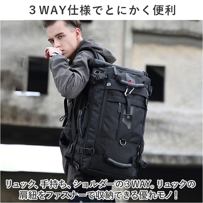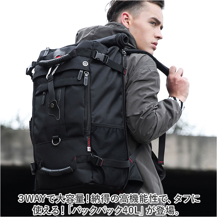 | 商品説明 | ・・・3WAYで大容量!納得の高機能性で、タフに使える!「バックパック40L」が登場。 ・【3WAY仕様でとにかく便利】 ・リュック、手持ち、ショルダーの3WAY。リュックの肩紐をファスナーで収納できる優れモノ! ・【なんでも入る大容量!】 ・旅行、通勤通学、登山などのレジャー、防災バッグ。どんなシーンの荷物にも対応可能の大容量。 ・【クッションINのPCポケット】 ・メインルームにはPCやタブレットが収納できるポケット有り!クッションINで持ち歩きも安心。 ・【スクエアタイプで持ちやすい】 ・スクエアタイプなので、横にしてビジネスバッグとショルダー、縦でリュックと持ちやすい形状。 ・【持ち手とナスカン付きで便利】 ・重い荷物を扱いやすよう、プラスチックハンドルを3つ搭載。ナスカンDカン付きで使いやすい。 ・【整理整頓できるポケット多数】 ・フロント、サイドなどにポケットが多数有。小物を仕分けて収納できるので整理整頓できる。 ・【肩に優しいやわらかパットつき】 ・背面とリュックの肩紐にはクッション性のあるやわらかパットつき。負担がかかりにくい仕様。 ・【Wチェストベルトで重さを軽減】 ・チェストベルトを2箇所に搭載。身体にフィットし重さが軽減。長時間の着用もストレスフリー。 ・【ロック機能付きで安心】 ・ファスナーの穴にナンバーロックの南京錠を挿せる、ロック機能つき。セキュリティー面も安心。 ・【ポケット仕様】 ・メイン収納:PCポケット×1 ・サイド部分:オープンポケット×1 ・チェストベルト部分:ファスナーポケット×2 ・フロント部分:ファスナーポケット×2 ・フロント収納:オープンポケット×3、ペンポケット×2 |
