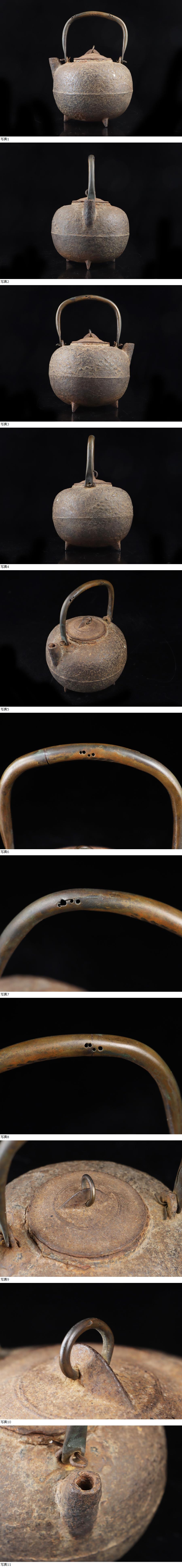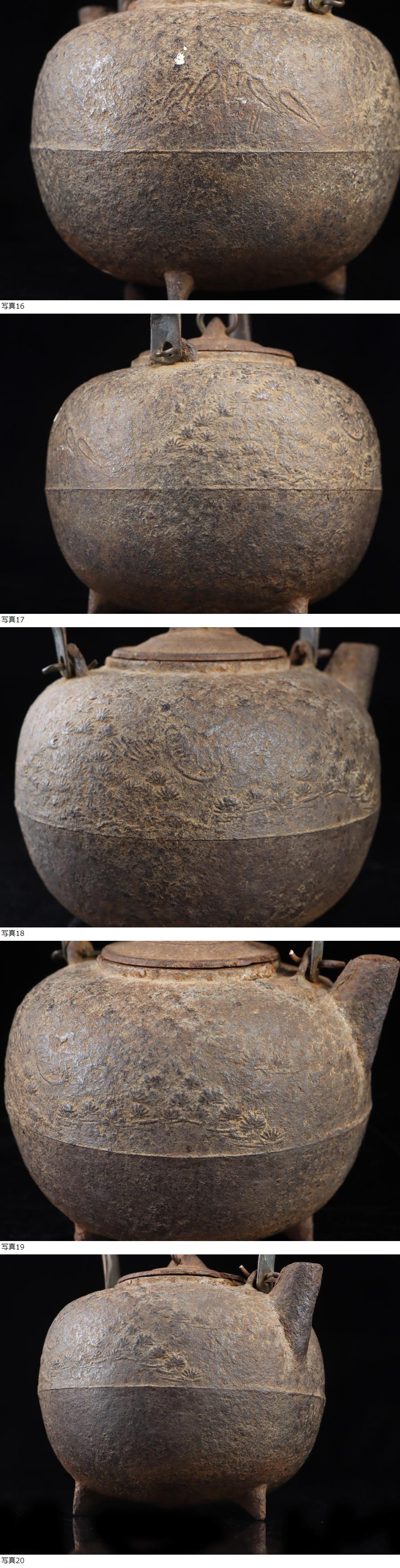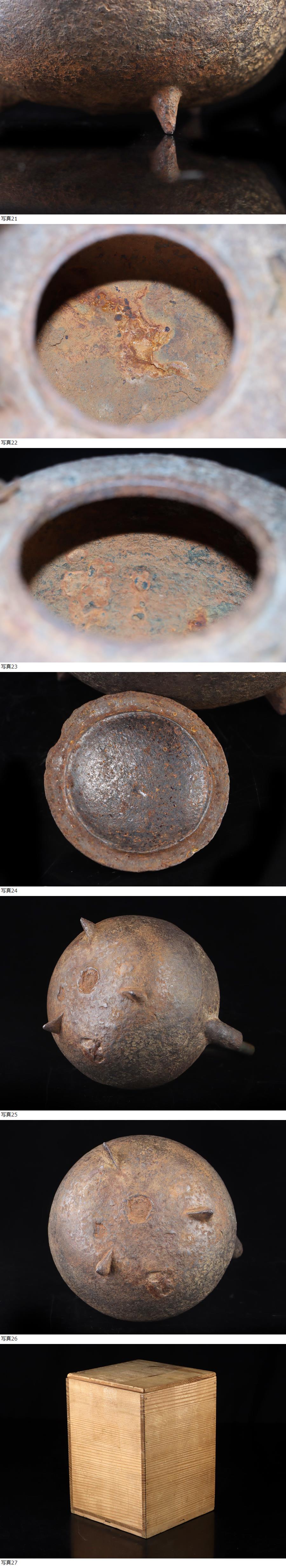 サイズ(約) 高さ 19㎝/横 14㎝/幅 13.5㎝/総重量 850g 付属品 - ※鉄瓶状態について※ 当社、鉄瓶の全て、24時間水張り確認、直火沸かし確認済みの鉄瓶でございます。 使用には全く問題ないと判断させていただいた商品のみを、出品させていただきます。 商品使用状態は、ご安心くださいませ。 ※24時間水漏れなし、確認済み ※ご使用後の水漏れに関しては責任を負えません。ご了承ください。 名家旧蔵 蔵出うぶ荷 本物保証 希少名作 日之丸形 鉄蓋 環摘銅手砲口三足鉄瓶 鯉松彫刻 虫食持ち手 鉄砲口 時代名作品! 本物保証 名家の蔵に長年眠っていた希少な鉄瓶を授かることが出来ましたので出品させていただきます! 姿、珍しく、希少形状の江戸鉄瓶!本歌名作品になります! 状態、時代経過の汚れ等ございますが、致命的な傷みなどなく良品です。 大事にしていただける方の入札お待ちしております! |