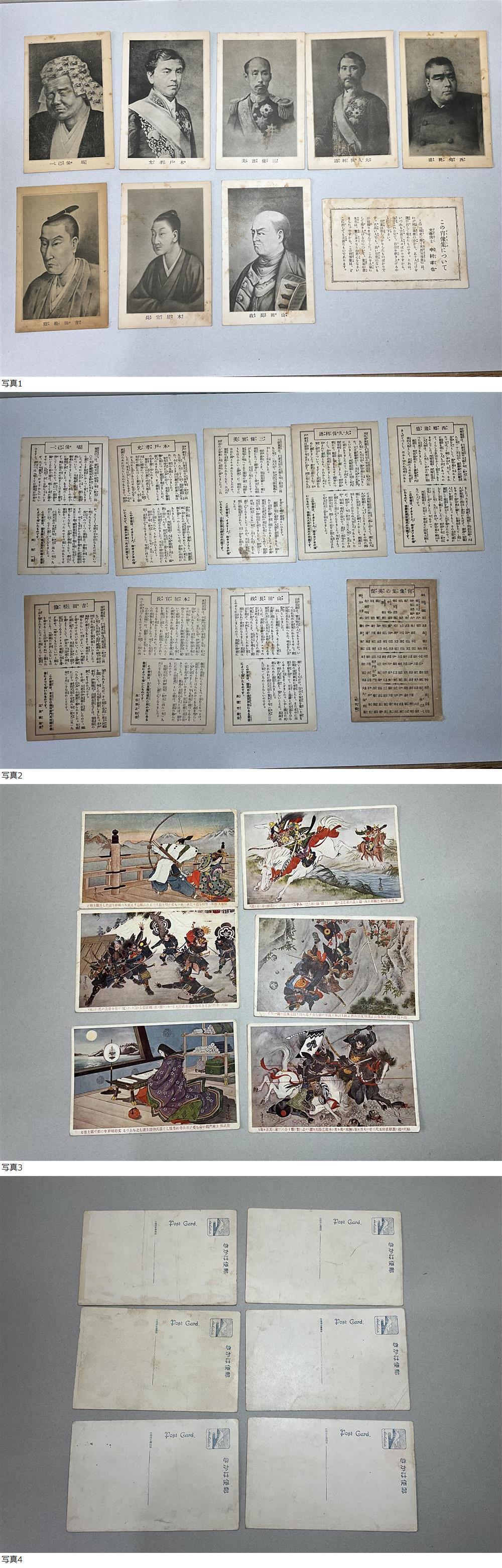 少年倶楽部の附録の「国史に輝く英傑集」不揃い48枚で外箱はありません。他、歴史の名場面の絵葉書6枚です。