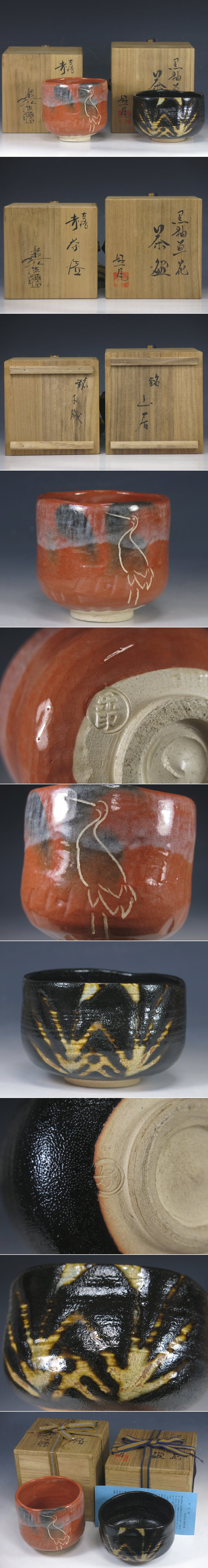 | 商品名 | 茶道具 茶碗 2点まとめて 福井楽印 立鶴赤茶碗 銘「千歳」 丹羽好一 黒釉草花茶碗 銘「山居」 共布 共箱 煎茶道具 |