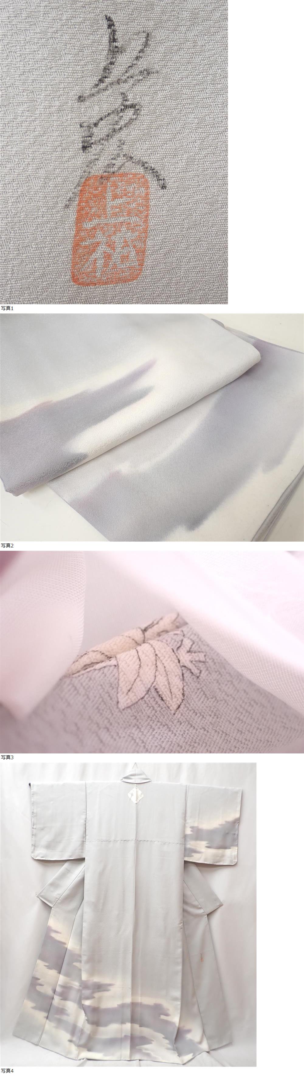 未使用 しつけ糸付き 作家物 正絹 訪問着 一つ紋 身丈157cm(+5.5cm) 裄丈62cm 薄灰 暈し 霞文 | ||||