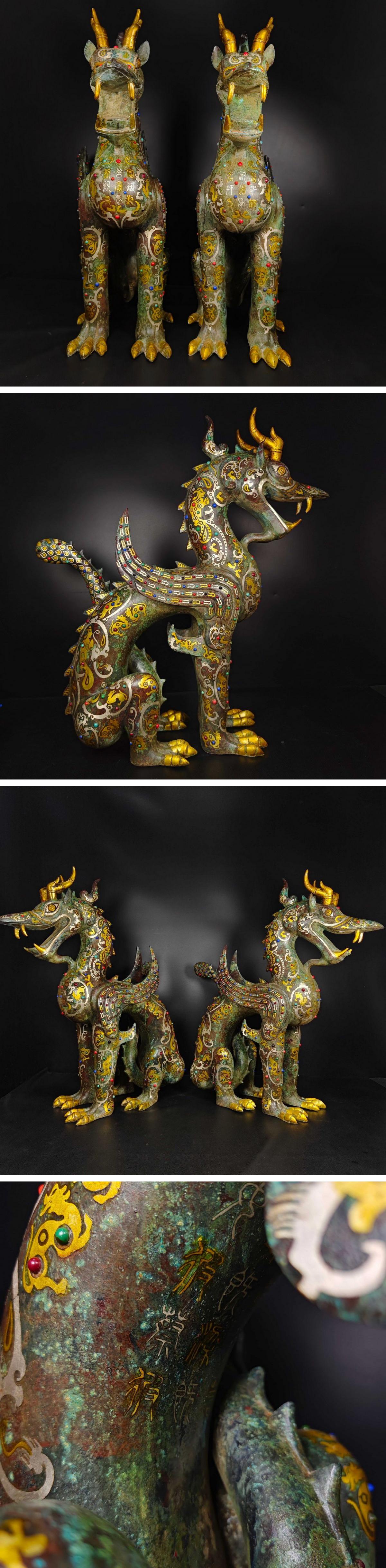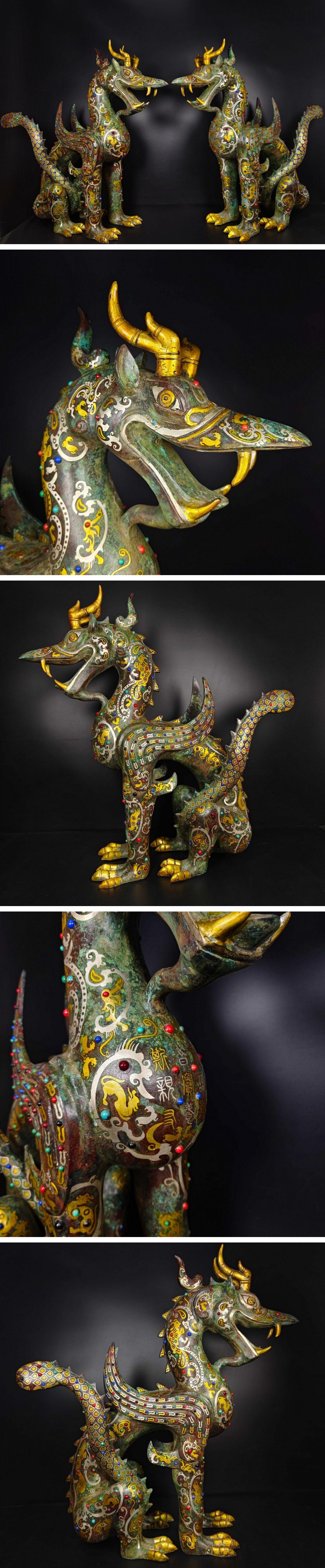 【雲錦】1円から 時代物 ブロンズ 象嵌金銀 瑞獣龍置物一双36㎏ 中国骨董品 材質保証 古美術 骨董品8L19-17S24