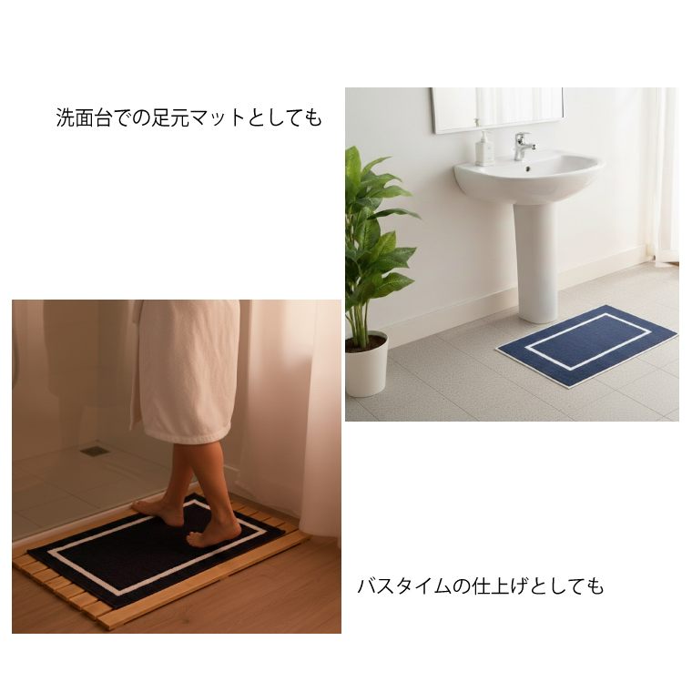 〇仕様 | ・洗練されたバイカラーデザイン。日常に溶け込むタオル地バスマット |