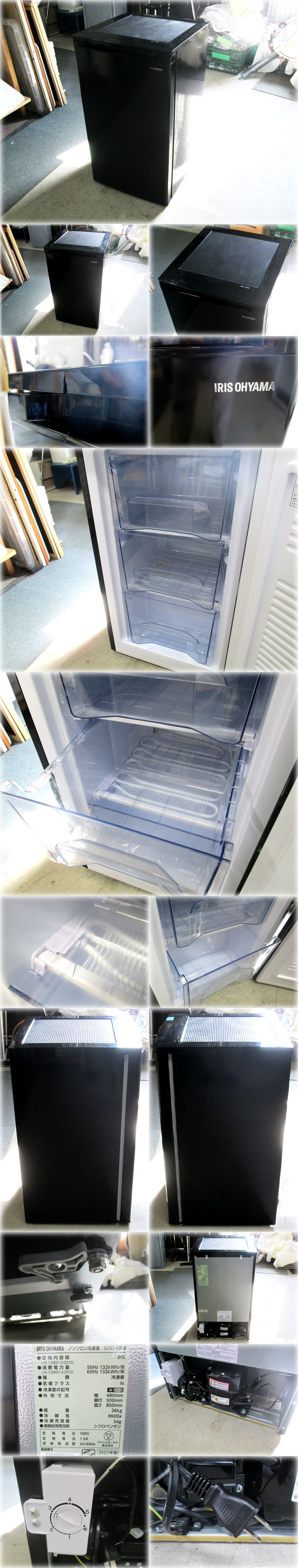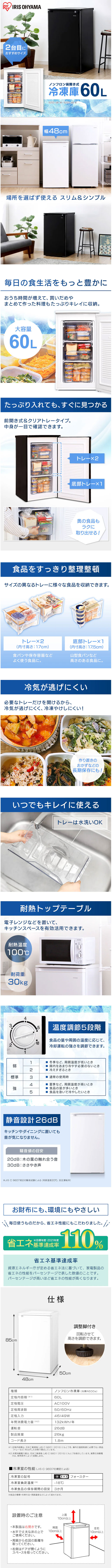 アイリスオーヤマ 1ドア冷凍庫 IUSD-6B-B を出品いたします。 ■特徴■ 2台目におすすめサイズの ノンフロン前開き式冷凍庫です。 前開きで、庫内の整理がしやすい引き出し式。 トレーは水洗いOKでいつでもきれいに使えます。 耐熱トップテーブルなので電子レンジなどをおいて、 キッチンスペースを有効活用できます。 ※耐熱温度100℃、耐荷重30kg 温度調節も3段階。 食品の量や周囲の温度に応じて、 冷却運転の強さを調節できます。 静音設計 運転音26dBでキッチンやダイニングに 置いても音が気になりません。