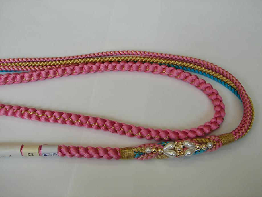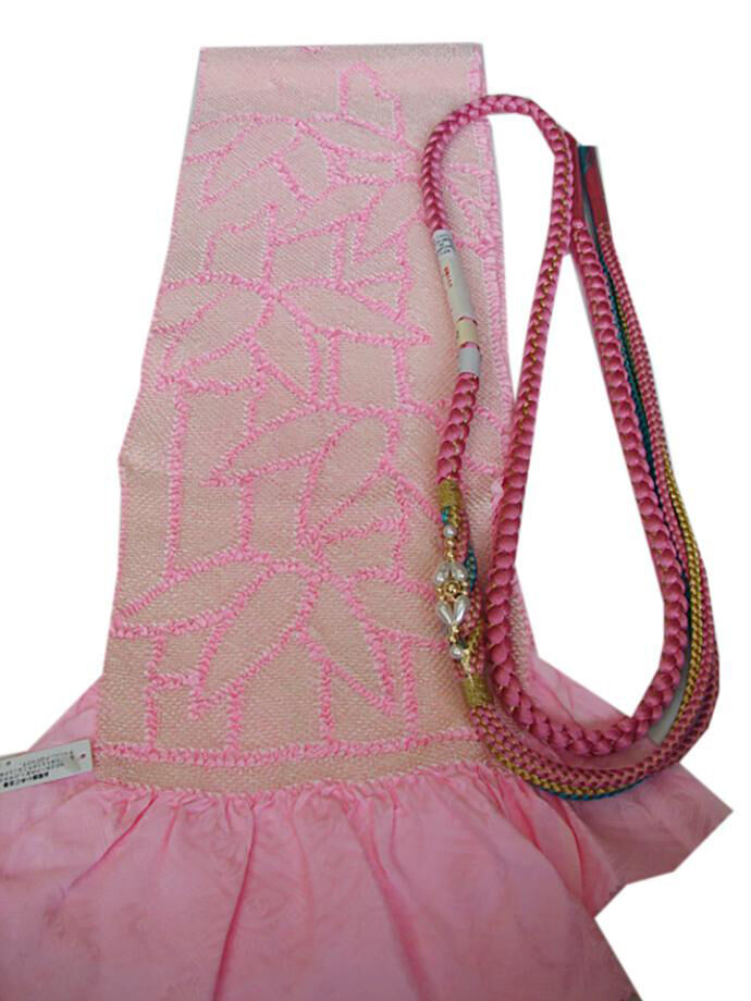 ●帯揚: 正絹。 薄ピンク色地に白色のしっかりとした四ツ巻き総絞り。 長さ126cm 幅20cm (絞った状態での寸法です) ●帯〆: 正絹。 桃花色地に金糸やあま色を編みこんだ組紐に人工パールの飾り付(中国製)長さ162cm 幅1.0cm |