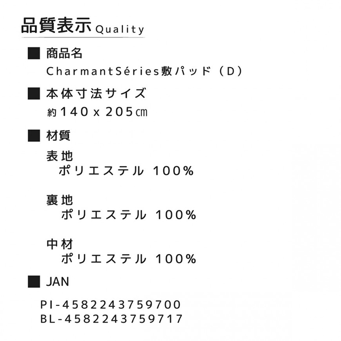 | [表地]ポリエステル100% [裏地]ポリエステル100% [中材]ポリエステル100% |