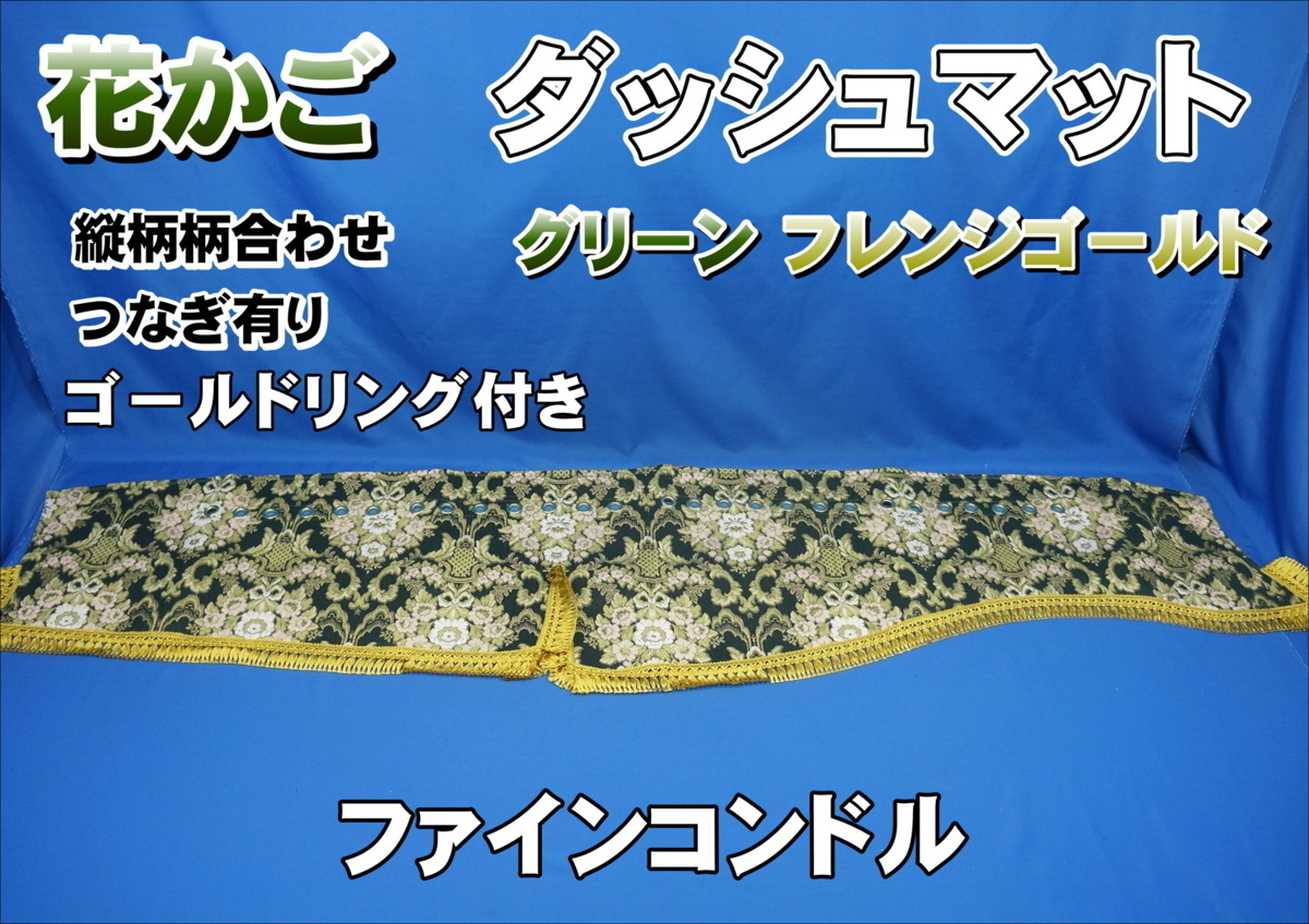 | 商品紹介 | ■ダッシュマット(ビニール無し) ※5000円アップでビニールキルト付き、又は、綿入りキルト付きに変更可能です。 ご希望の方は、ご注文後お知らせください。 ■ゴールドリング付き ■柄:花かご(縦柄・つなぎ有り) ■色:グリーン ■フレンジ:ゴールド ■標準/ワイド ※ご注文後、標準かワイドかをお知らせください。 ※ワインもございますので、お問い合わせください! ※同色の生地でフロアマット等も製作可能です。お問い合わせ下さい! |