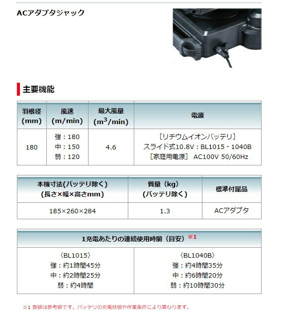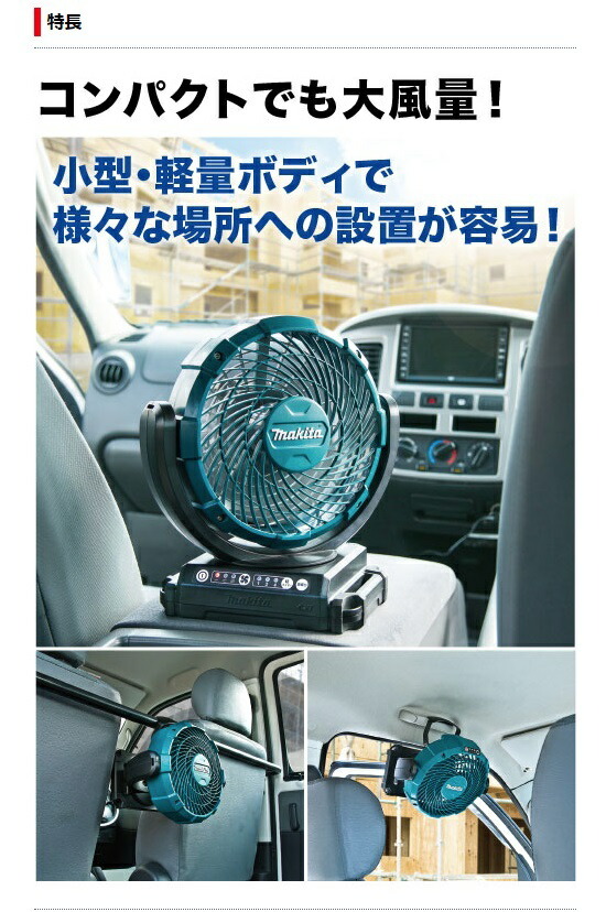マキタ makita充電式ファンCF101DZ本体のみです。※バッテリ・充電器は別販売です。コンパクトボディで大風量 自動首振りモデルが新登場!■コンパクトでも大風量!小型・軽量ボディで様々な場所への設置が容易!風が行き渡る自動首振り機能・風向角度調整可能風向を上下左右に調整可能。(手動)・風量調整3段階強/中/弱の切替えが可能。■手軽に運べるコンパクトサイズ!■ACアダプタジャック