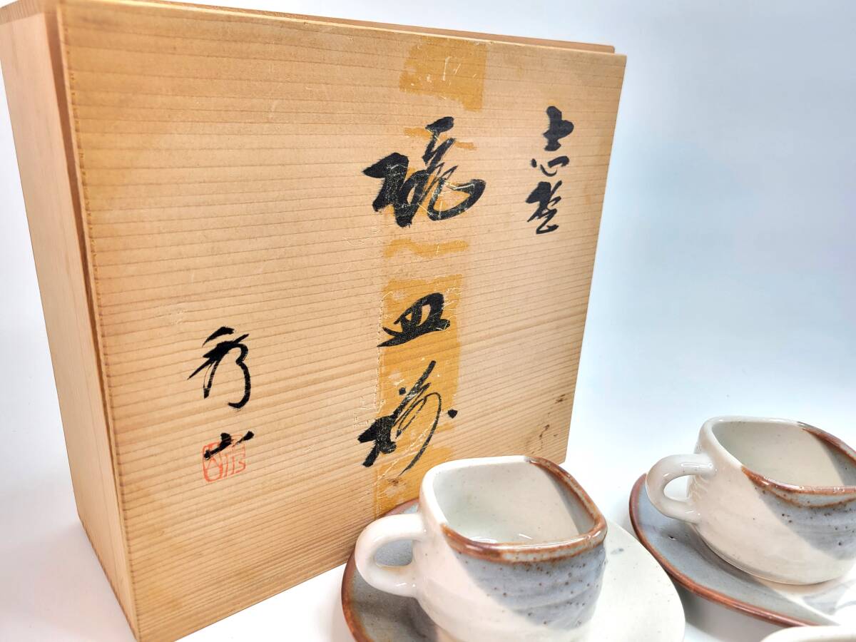 【送料無料・長期保管品】志野焼 秀山作 カップ&ソーサー 5点セット 桐箱付き
