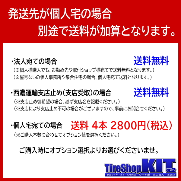送料について | ●タイヤホイールSETの送料 : 無料 ●タイヤ単品の送料 : 法人宛て/西濃運輸支店止めで無料 (※個人宅宛ては別途送料掛かります) ●ホイール単品の送料 : 無料 ●その他用品(ナットなど) : 880円(税別) ※北海道/沖縄県/離島を除き全国一律での送料となります。 ※北海道は商品それぞれに別途で下記送料が掛かります。 ・タイヤホイールSET : 2200円(税別) ・タイヤ単品 : 1本につき550円(税別) ・ホイール単品 : 2200円(税別) ・その他用品 : 1430円(税別) ※沖縄県・離島の場合はお問い合わせください。 |