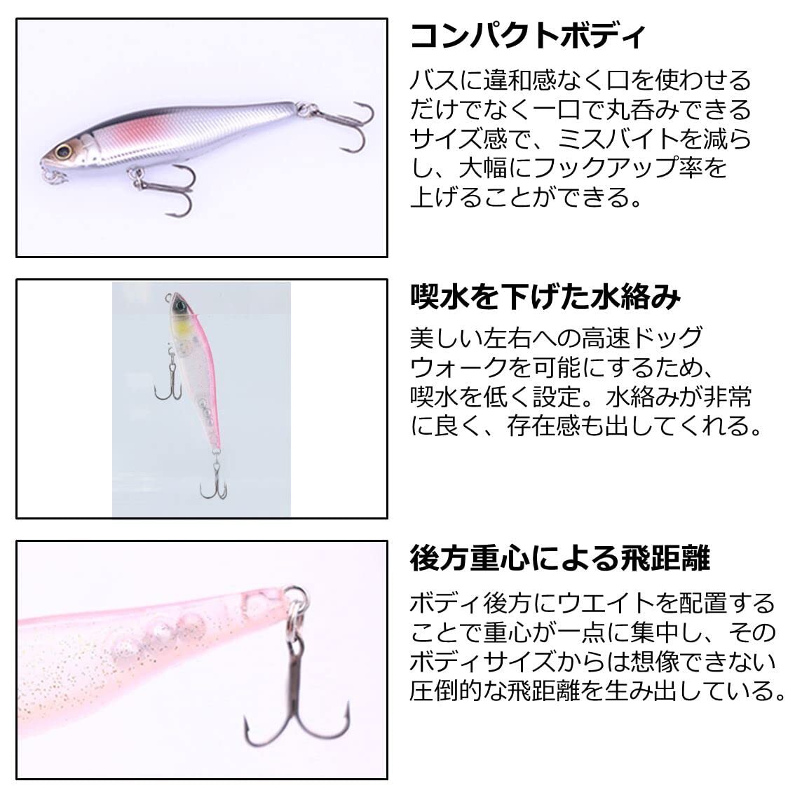 | 商品説明 | サイズ(mm):60 自重(g):4.2 美しい左右への高速ドッグウォークを可能にするため、喫水を低く設定。水絡みが非常に良く、存在感も出してくれる。 コンパクトボディからは想像できない飛距離を叩きだす。ボディ後方に3発のウエイトを配置し、抵抗の少ないボディを相まって遠投することが可能。