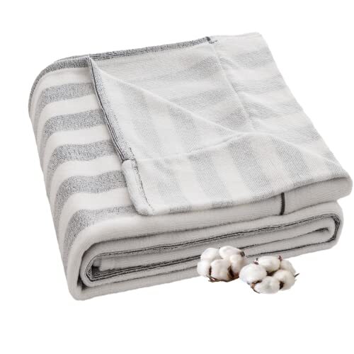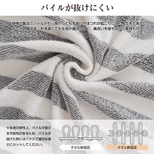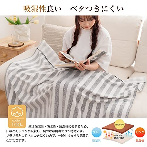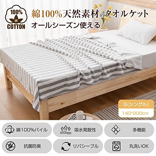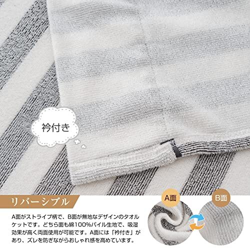 | 商品説明 | 【肌に優しい綿100%パイル】パイル糸(毛羽部分)=綿100%、地糸=ポリエステル100%(パイルの抜けにくい性能を出すために、地糸はポリエステルを使用しています)。 両面の肌に直接触るパイル部分は、ふんわり柔らかな天然素材綿100%を使用します。吸水性・通気性・吸湿性に優れたコットンを汗をしっかり吸収し、ベタつきがにく、爽やかな肌触りを保ち、汗ばむ季節も吸水性があるのでサラッと快適に眠れます。両面はすべてタオル地で、パイルの毛足が長くして厚地に仕上げ、柔らかさをより感じいただけます。人にも環境にも優しい天然素材のコットンをたっぷり使用するタオルケットので、お肌のデリケートな方やお子供も安心してお使いいただけます。 【吸湿通気性・リバシーブル】 両面が使えるやさしい肌触りのタオルケットです。パイルは綿100%で、吸水性が良いので寝ている間の汗や湿気を吸ってさらさらに保ちます。なめらかでしっかりしたボリュームと通気性があります。両面は異なるスタイルです。A面が縞柄(衿付きあり)で、B面が白い無地のタオル地です。シンプルなスタイルで、和室にも洋室にもぴったりです。お好みに合わせて、好きな面をお選びください。※両面を貼り合わせる必要があるため、特殊加工で仕上がりは少し硬いかもしれませんが、1回洗濯するとふんわり感が戻ってきます。 【パイルが抜けにくい】 パイルの抜けを防ぐため、本製品は短いパイルを採用しています。毛羽落ちを抑えて糸の劣化を防ぐために、マイヤー織りの製法を使用します。マイヤー織りとは、パイル糸を縦横の基布に絡ませて織り上げる製法です。パイルが抜けにくく、長く使うことができます。また、通常のタオルと比較するとポリエステル地糸の密度がつまっているため、パイルが抜けにくい構造になっております。 ※生地特性の上で、パイルが抜ける可能性があるため、パイルが抜けた際にはハサミで適切な長さにカットしてください。 【オールシーズン・様々な用途】肌掛けのコットン素材なので、一年中お使いいただけます。汗ばむ季節は吸水性があるのでサラッと快適で、冷房の効いた部屋での毛布としてもお使いいただけます。肌寒い季節はパイルが程よく空気を含んであたたかく、毛布の代わりに布団のインナーとしても使えます。また、シーツとしても適しています。 ホームだけでなく、温泉・旅行・お花見などいろいろなシーンで大活躍します。自分が使うだけではなく、同僚、上司、お客様へのお礼、友達祝い、親孝行、祝日のギフトにもおすすめです。 【丸洗いOK・いつも清潔に】 ご家庭の洗濯機で洗えます(洗濯ネットをご使用ください)。また、タンブラー乾燥は縮みの原因となりますのでお避けください。少量の水でのお洗濯、または柔軟剤のご使用はパイルの組織を壊してしまい、毛羽抜けの原因ともなりますので、お控えください。お洗濯の際は、単品で洗ってください。洗濯後もそのまま放置せず、速やかに広げて干してください。※お手入れ方法は、洗濯表示まで参考してください。万が一商品に不具合(初期不良など)がある場合は、お気軽に当店までにご連絡ください。 【梅雨に備える寝具】通気性に優れたサラッとタオルケットです。梅雨の合間の晴れた日は見逃さずタオルケットを干すようにしてください。眠っている間の汚れも溜まっているのでなるべくこまめに交換・洗濯をおすすめします。 どうしても干せない場合は、布団乾燥機などを使って湿気を取るようにしましょう。