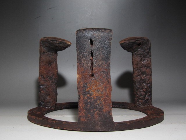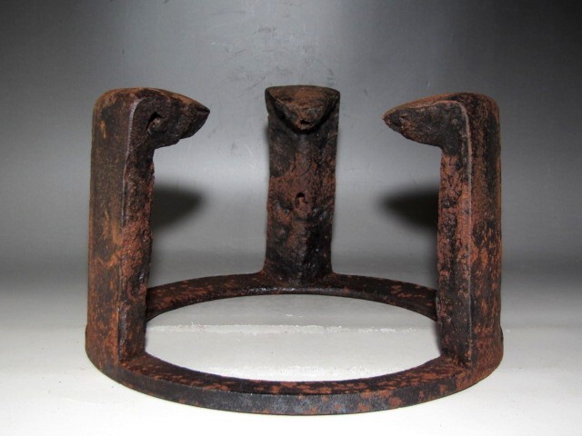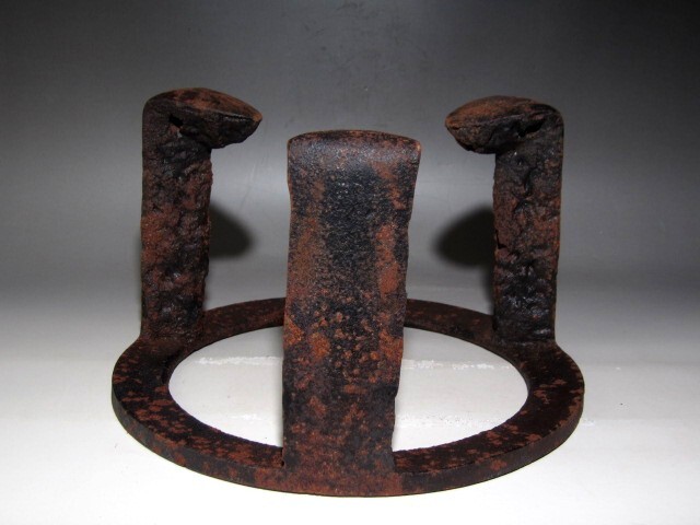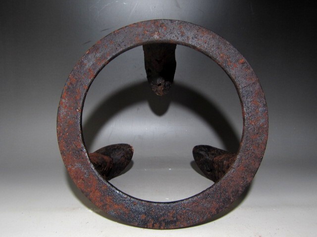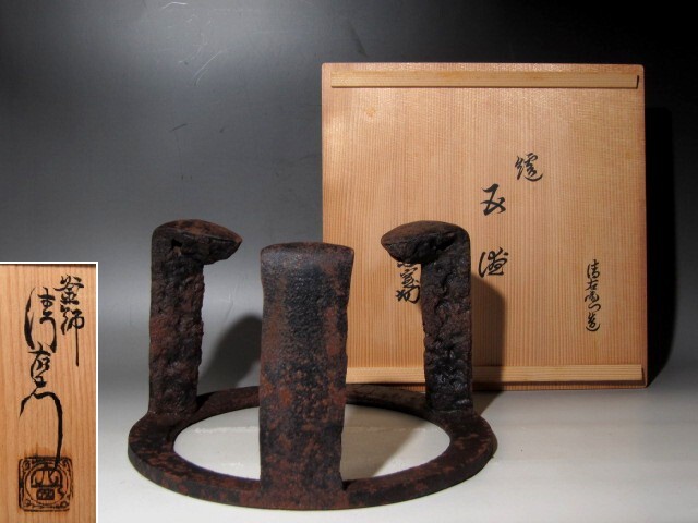 千家十職大西清右衛門作の炉用五徳です。 鍛鉄の技術で作られた、名工の貴重な逸品です。 箱蓋裏に裏千家十四世淡々斎の花押があります。 【大西清右衛門(おおにしせいえもん)】 千家十職の釜師。大西家は室町時代後期から400年以上続く京釜師の家。 四代目当主が清右衛門をなのり、六代目以降九代目をのぞき、代々の当主は清右衛門という名を継いだ。 京都市中京区の三条釜座(かまんざ)に工房があり、「大西清右衛門美術館」も併設されている。 現在は十六代清右衛門が当主。 サイズ 直径25cm/高さ16cm(多少の誤差はお許しください) 状態 骨董品という事をご勘案頂き、時代経過のスレや、小さな傷がある場合があるかもしれませんのでご承知置きください。 | |||
