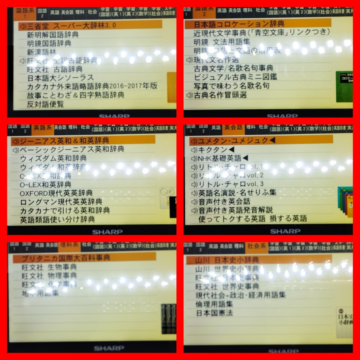 国語系辞書スーパー大辞林、新明解国語辞典、明鏡国語辞典、知っておきたい日本語コロケーション辞典、日本語大シソーラス類語検索大辞典、「現代用語の基礎知識」カタカナ外来語略語辞典、三省堂反対語便覧、四字熟語辞典、故事ことわざ辞典、出口汪現代文講義の実況中継①/②、明鏡文法用語集、明鏡口語と文語の活用表、近現代文学事典、新漢語林、センター試験飯塚敏夫漢文講義の実況中継、旺文社古語辞典、旺文社全訳古語辞典 他