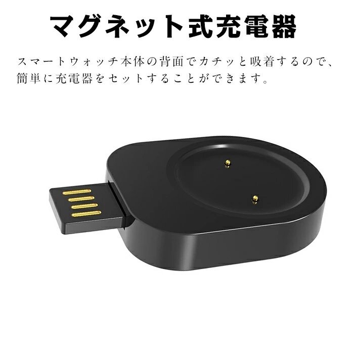 【マグネット式充電器】スマートウォッチ本体の背面でカチッと吸着するので、簡単に充電器をセットすることができます。