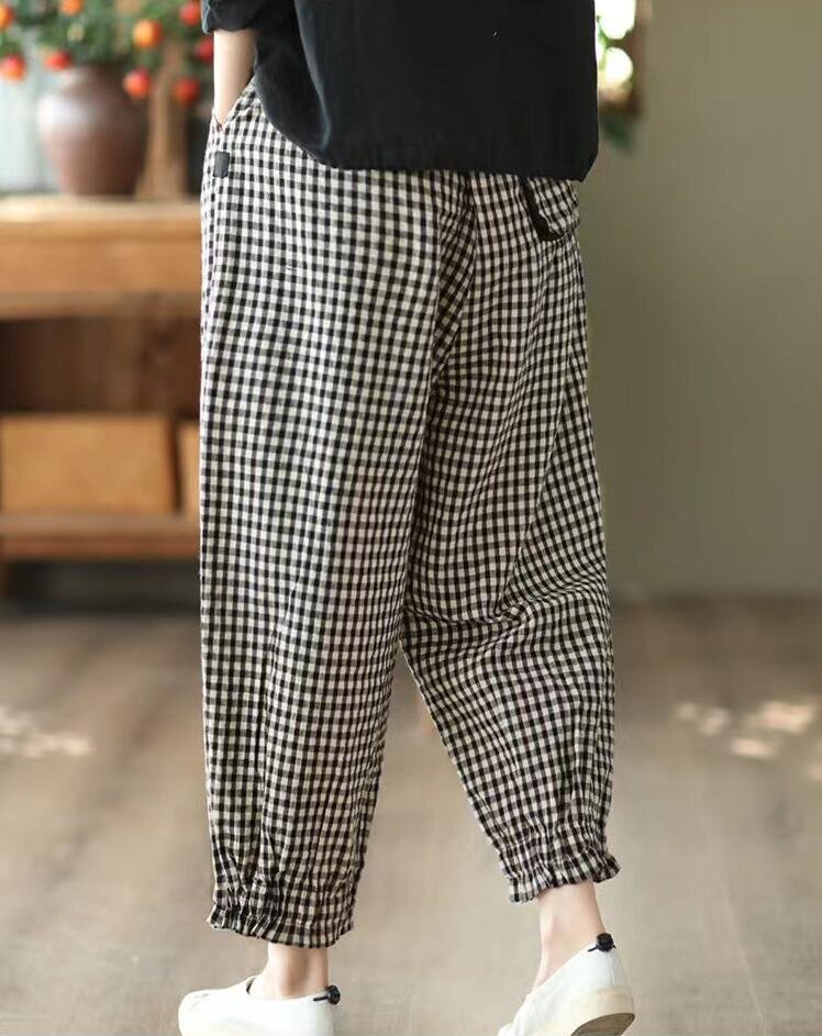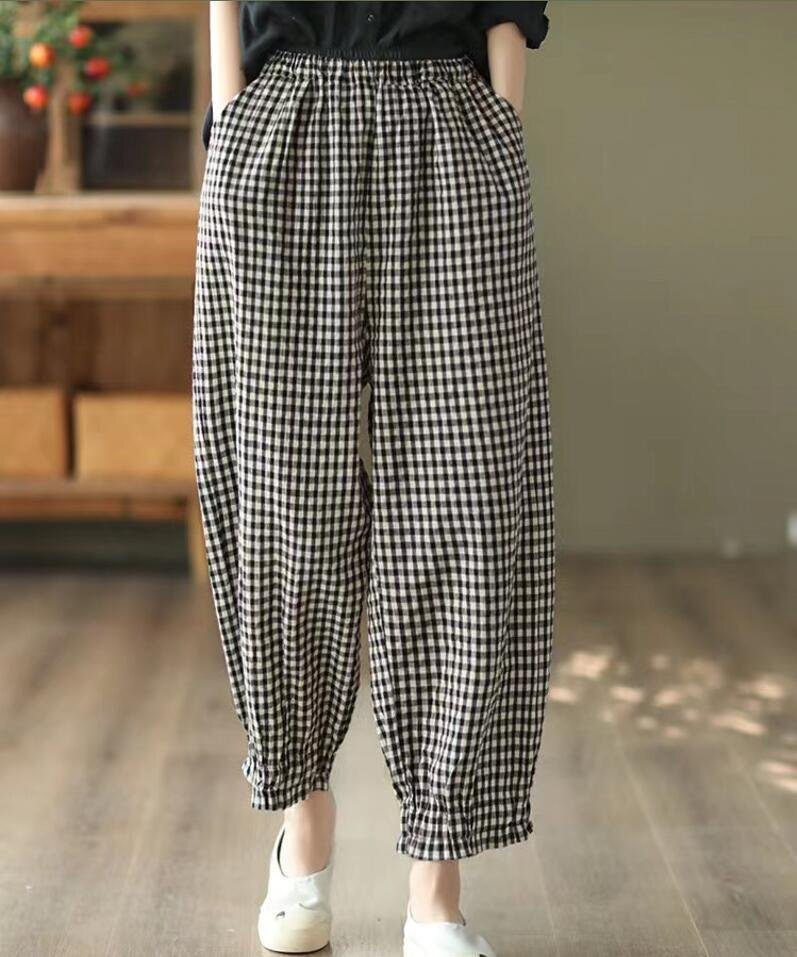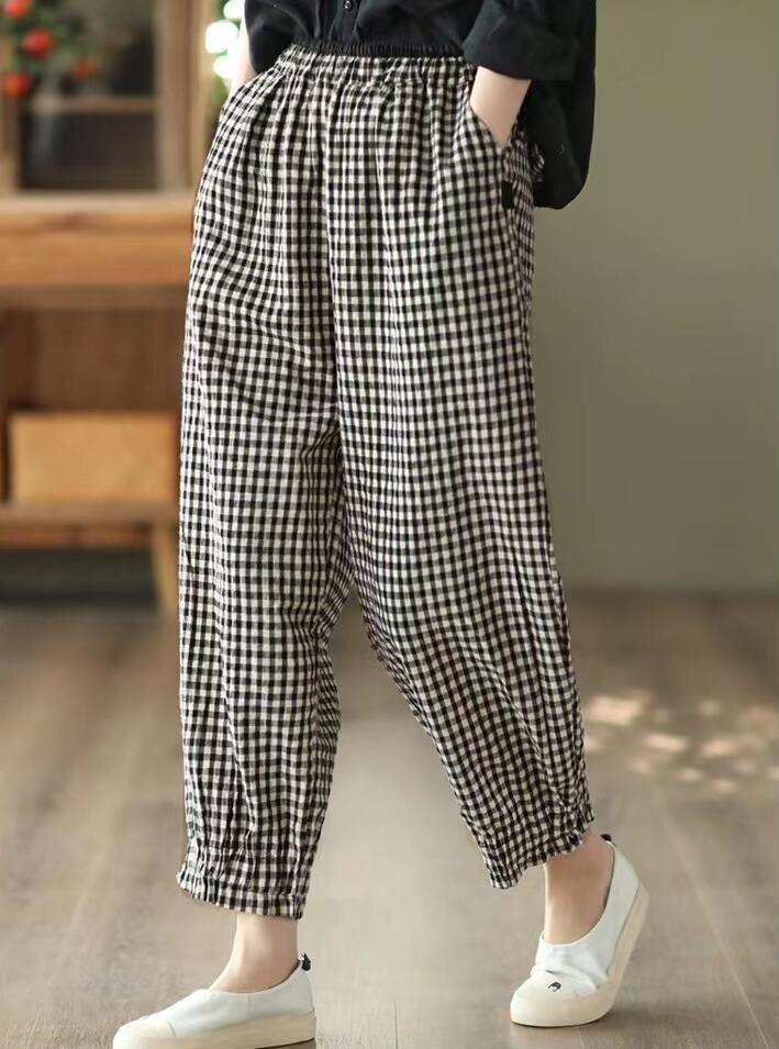春新品 レディースボトムス 大人気 綿麻 ガウチョパンツ 大チェック柄 大きいサイズ ワイドパンツ★Lサイズ