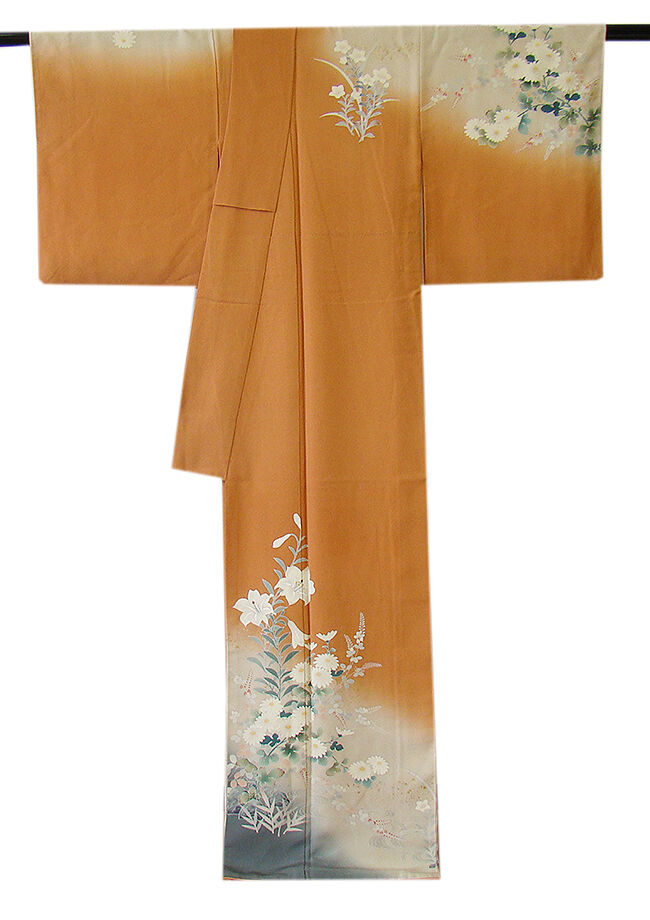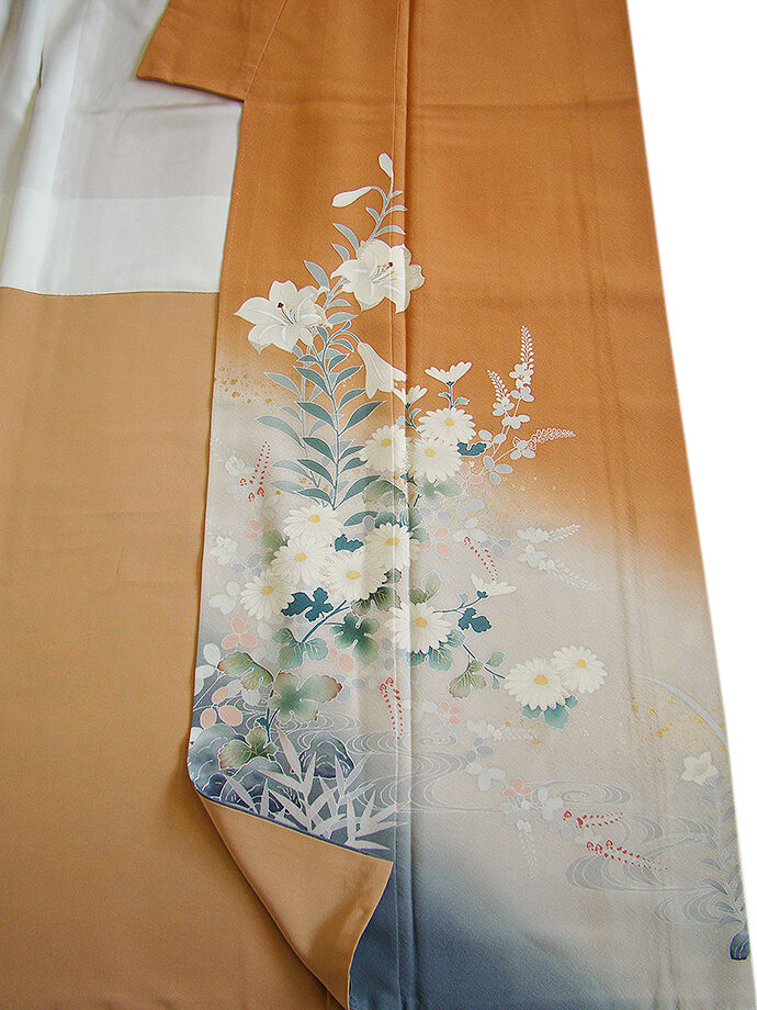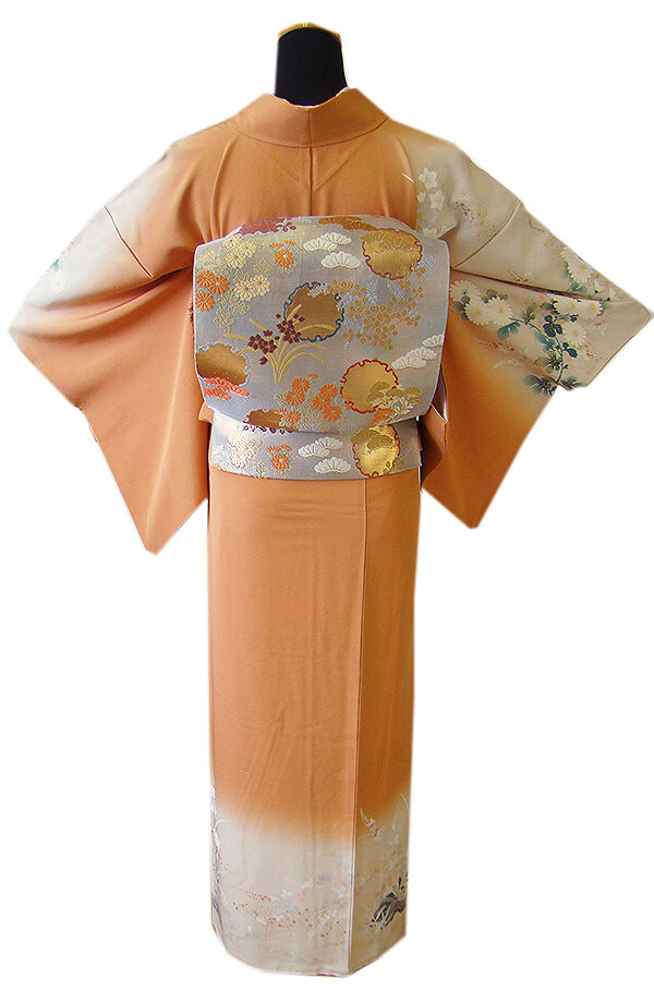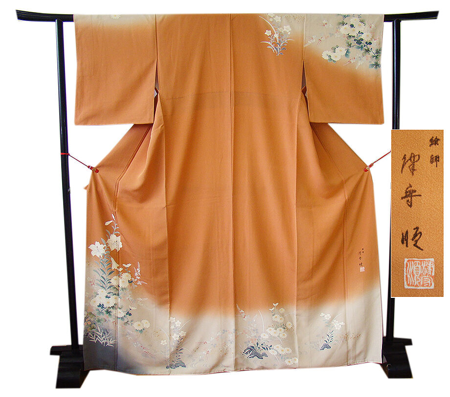 | 商品説明 | こちらのお品は袷でございますので、10月~5月までお召頂ければと思います。 しなやかな手触りの着心地良いさらりとした滑らかな重めの極上ちりめん地の生地、 江戸茶色地に裾にかけて藍鼠、砂色ぼかしに花草や流水柄の染柄に金彩加工仕立て、 八掛は薄い水柿色(正絹)、作家の落款入り、幅広い年代の方にお召頂けます。 しなやかな扱い易く〆易い箔織の袋帯(六通柄)は、 銀地に金糸等の雪輪文に花草柄の織柄が華やかな帯姿を演出しております。 帯揚げはちりめん地、サーモンピンク色地に地模様入り、 帯〆は平組、茶色地にベージュ、紫、金糸等の編み込みの組紐となっております。 |