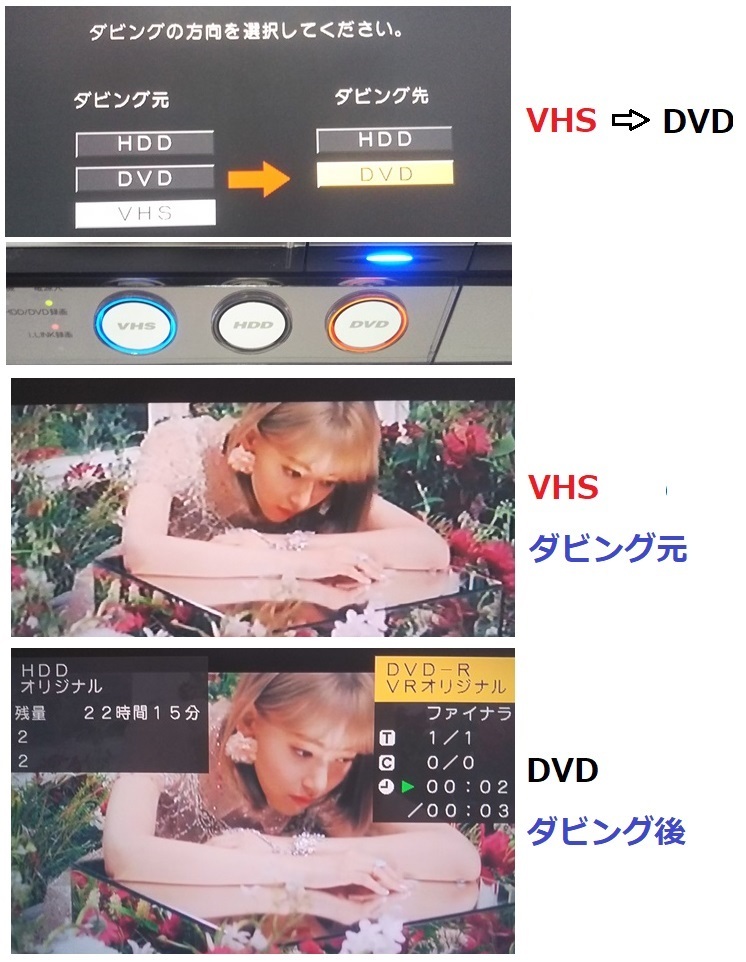 内臓HDD → VHSへダビング | 正常 | ※VHSのダビングテストには新品テープを使用しました。 |