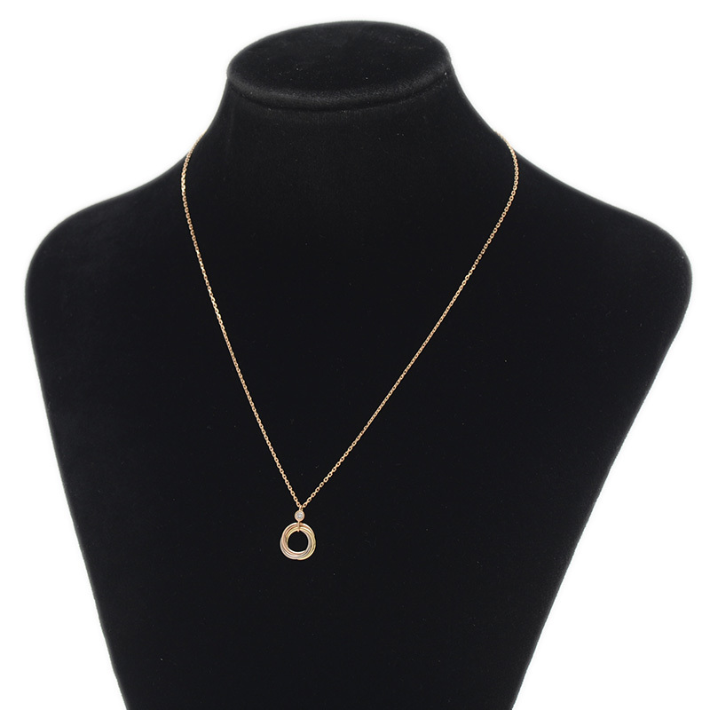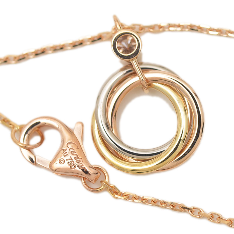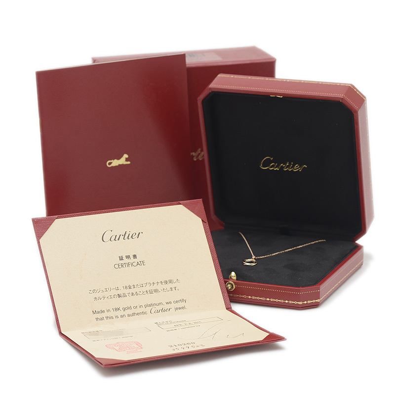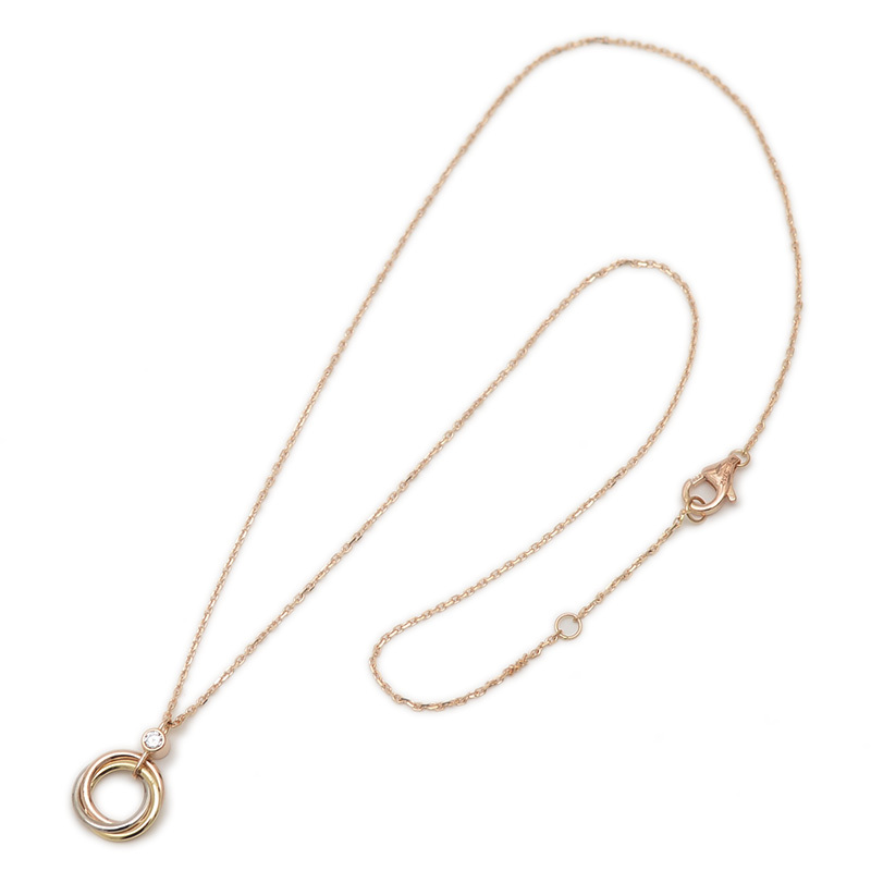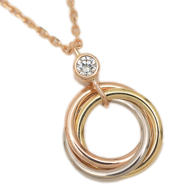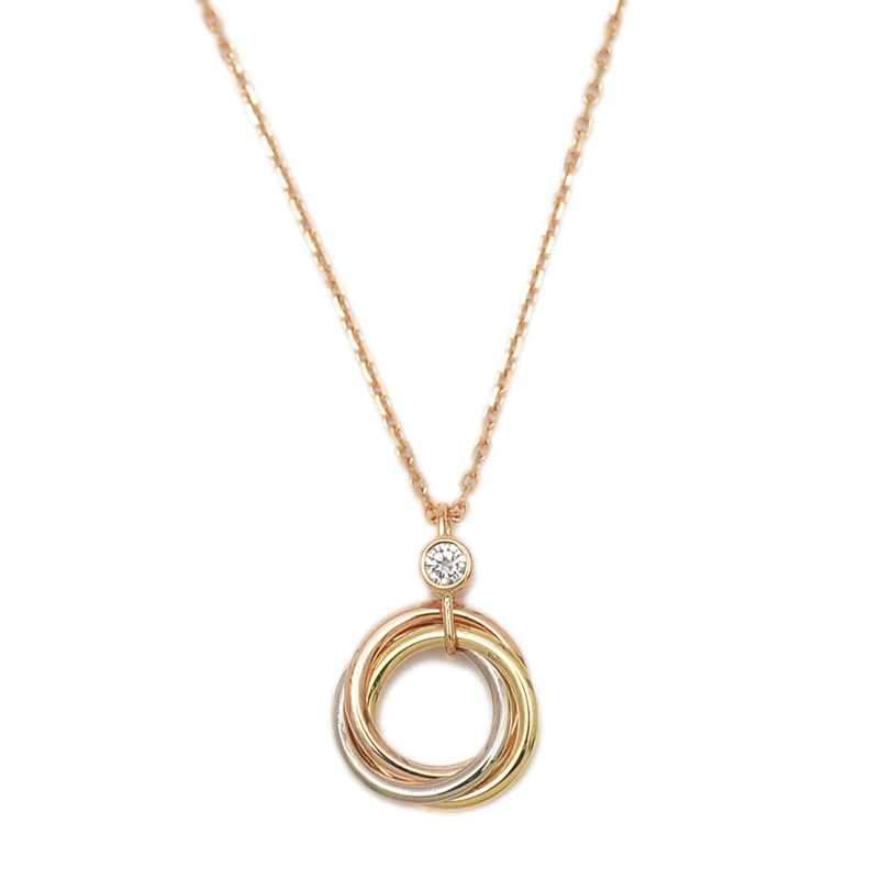 | 商品特徴 | イエロー、ピンク、ホワイトの3色の18Kゴールドリングが絡み合う、カルティエを象徴するデザインのネックレスです。愛、忠誠、友情という普遍的な絆を表現しており、それぞれのリングが放つ異なる輝きが胸元を上品に彩ります。ミニマルなサイズ感が愛らしく、日常使いから特別な日まで幅広く活躍する、タイムレスな魅力を持つ逸品です。 |