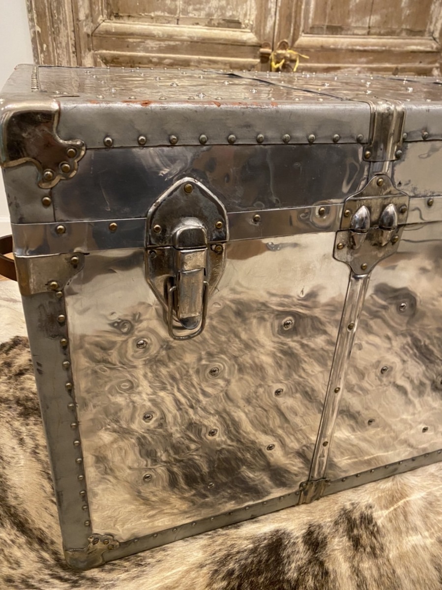 本体はアルミ製、内貼りは麻素材の生地、レザーベルト、鍵は真鍮製、鍵の付属なし。