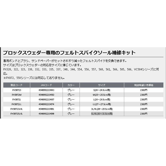 プロックスウェダー専用のフェルトスパイクソール補修キット 専用ボンドとブラシ、サンドペーパーがセットされすり減ったフェルトスパイクを 交換できます。 サイズはプロックスウェダーの対応足サイズに準じています。 PX320、322、323、330、332、333、335、337、340、344、554、556、557、560、 561、566、585、586、VC504シリーズに対応。 ※PX872、550シリーズには対応しておりません。 L(26~26.5cm用) ★複数在庫あります。4941826237736 |