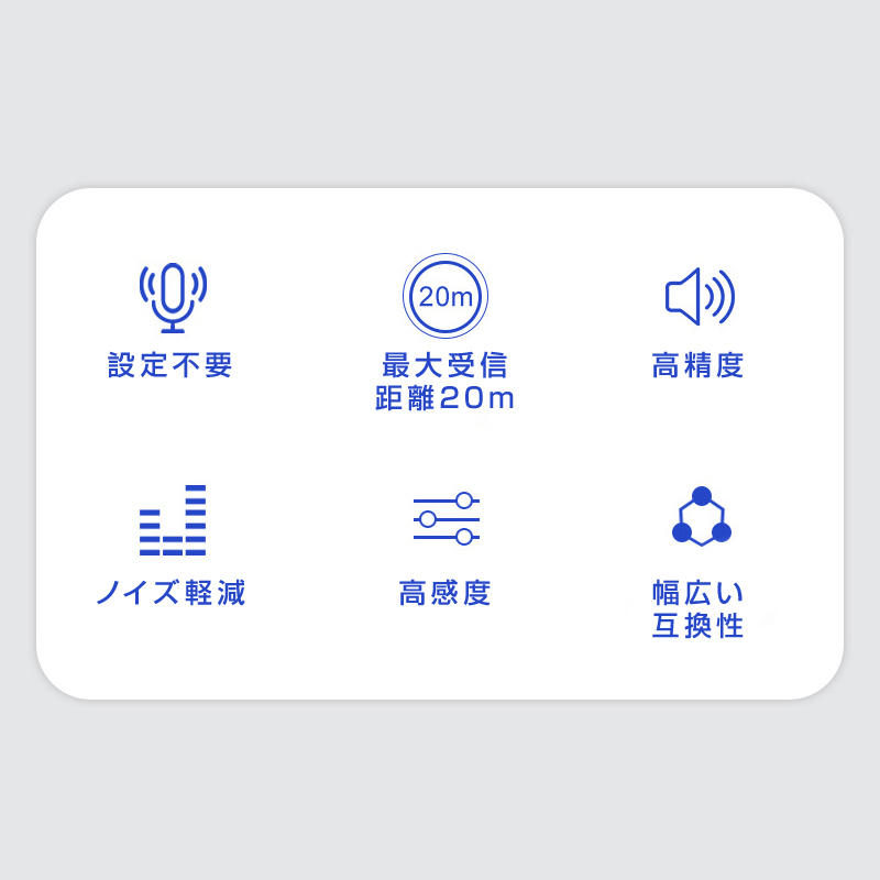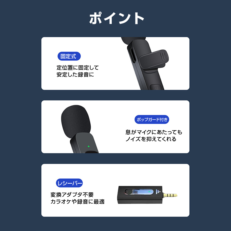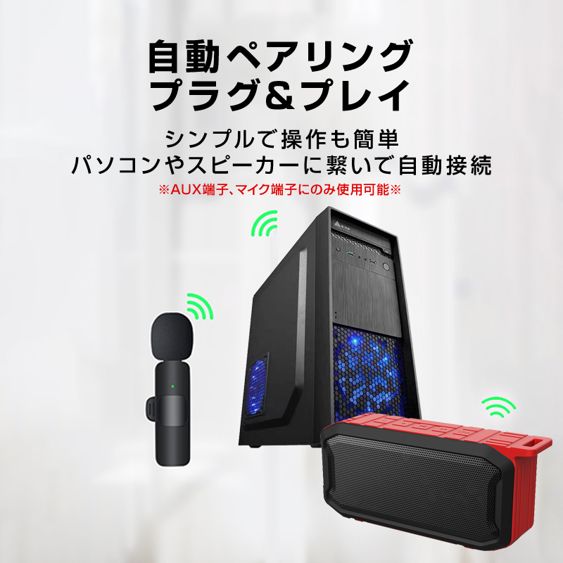 | マイク2個セットだから、2人実況や配信に便利。アプリダウンロードやBluetooth接続不要、自動ペアリング。幅広い機器に使用可能で、AUX端子またはマイク端子専用。PC、スピーカー、アンプ、一眼レフ、プロジェクター等と互換性有り。軽量で便利なクリップ式ワイヤレスマイク。内蔵チップにより高性能ノイズキャンセル搭載。授業や会議に便利な360°最大20mの広範囲集音。ニコニコ動画、InstagramやYoutubeにTiktok等のSNSや配信アプリ対応。カラオケ、Vlog、ライブストリーミングに最適。商品仕様:端子:3.5mm,寸法(幅*高さ*奥行):マイク:約15.0*63.0*10.0mm、レシーバー:約21.0*65.0*12.5mm,重量:マイク:約7g、レシーバー:約10g,材質:ABS他,内蔵バッテリー容量:50-100mAh,信号対雑音比:<70db,応答周波数:20Hz-20KHz,動作時間:約3-6時間,内容物:本体(マイクロフォントランスミッター*2、レシーバー*1)、充電用ケーブル*1、日本語取扱説明書,※本商品の仕様及び外観等は予告なく変更する場合がございます。※本商品は音声の送信のみ対応しています。音声の受信、または、映像の送受信には対応しておりません。※ヘッドセット端子では使用できません。 |