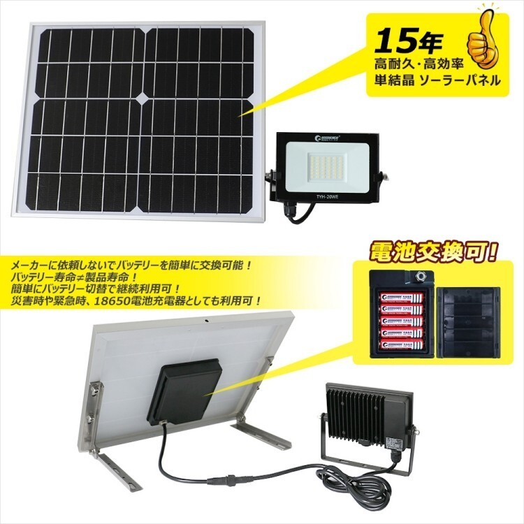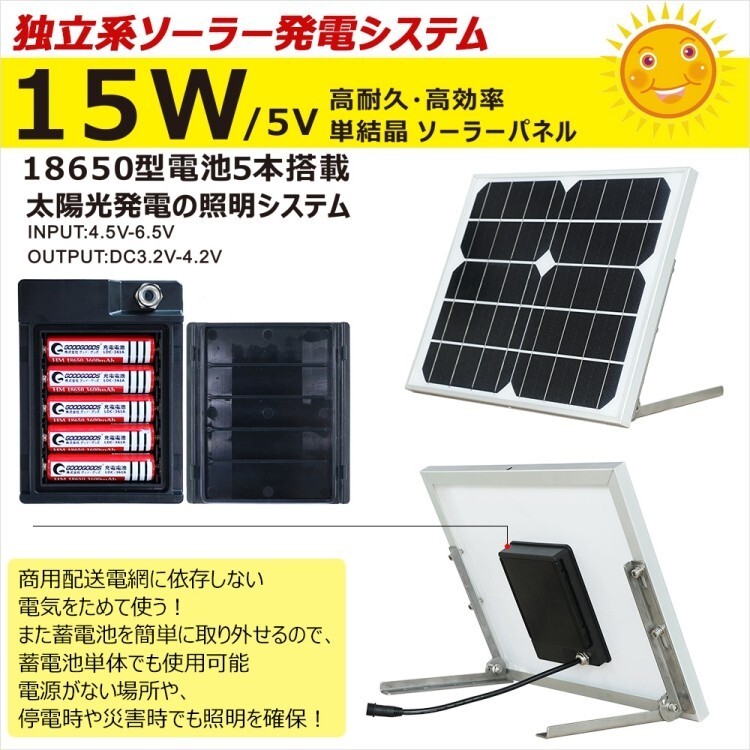 | セット内容 | LEDライト、ソーラーパネルTYH-5JB、18650型充電池(品番:LDC-361A)*5本、取扱説明書、保証書 | ||