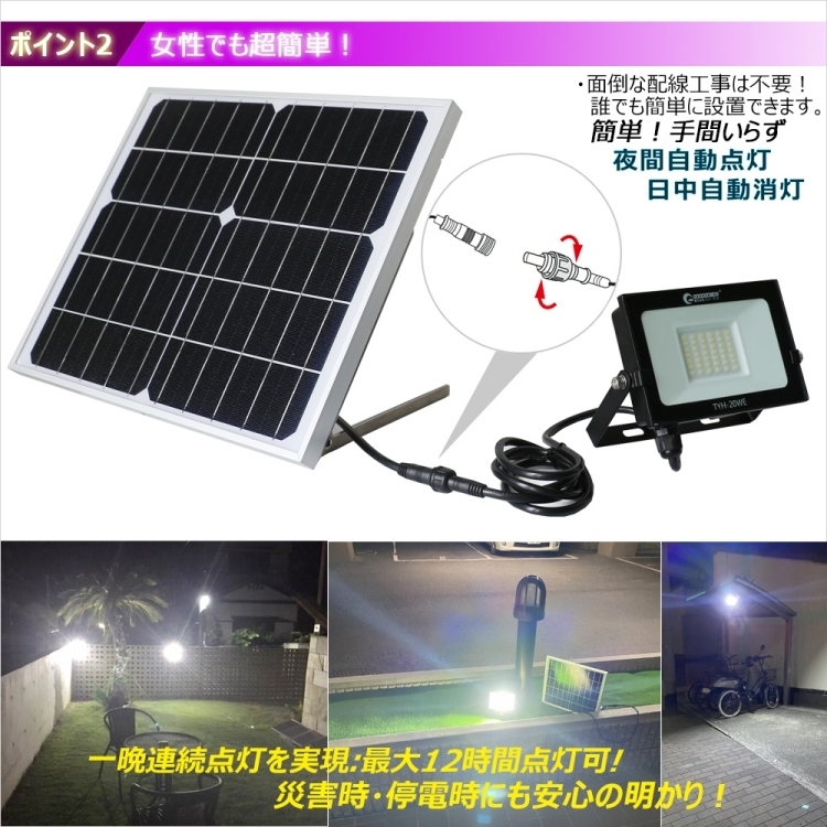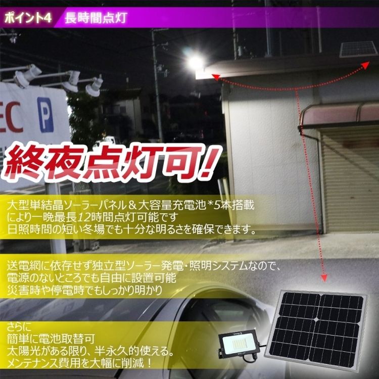 | 注意事項 | パネル面に光が当たっている間は、LEDライトは点灯しません。 ※パネル面全体が光センサーとなります。 ※予告なくデザインや仕様を変更する場合がございますので、ご了承ください。 ※他社製品をご利用頂く場合は、機器の仕様を確認してからご利用ください。 ※当店は長期的にLED作業灯、LED投光器、LED懐中電灯、LED電球など様々なLEDライトの提供に取り組んでおります。大量注文の場合は適当な割り引きの見積書を提供致します!当店にメールの問い合わせ大歓迎!! | ||
