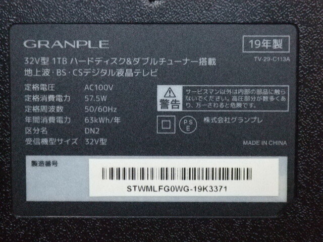 | グランプレ(GRANPLE) の 1TB HDD搭載 32インチ 地デジ LED液晶テレビです 型番:TV-29-C113A TV:地デジ x2、BSデジタル x2、110度CSデジタル x2 入力:HDMI x3、ビデオ 付属品:B-CASカード、リモコン、説明書 (電源コードは本体から直接出ています) 注意:その他の付属品はありません。 主な仕様 ・大容量1TB(1000GB)ハードディスク内蔵 ・裏番組録画対応、ダブルチューナー搭載 ・1番組録画中に他のデジタル放送を視聴可能 ・録りたい番組時間帯が重なって、2番組同時に録画可能 ・地上、BS、CS放送を同時に2番組、各1番組づつ録画可能 中古品ですので、若干の傷、汚れがあります。 液晶画面には目立つ傷はないと思います。 (多少の擦り傷などはありますので、ご了承ください) 基本的な動作は確認済ですが、BSデジタル、110度CSデジタルはアンテナがないため確認できていません。 細部に渡っての動作は確認しておりませんので、完璧な商品を求められる方は入札を控えてください。 内臓HDDの録画、再生の確認は行っています。 |
