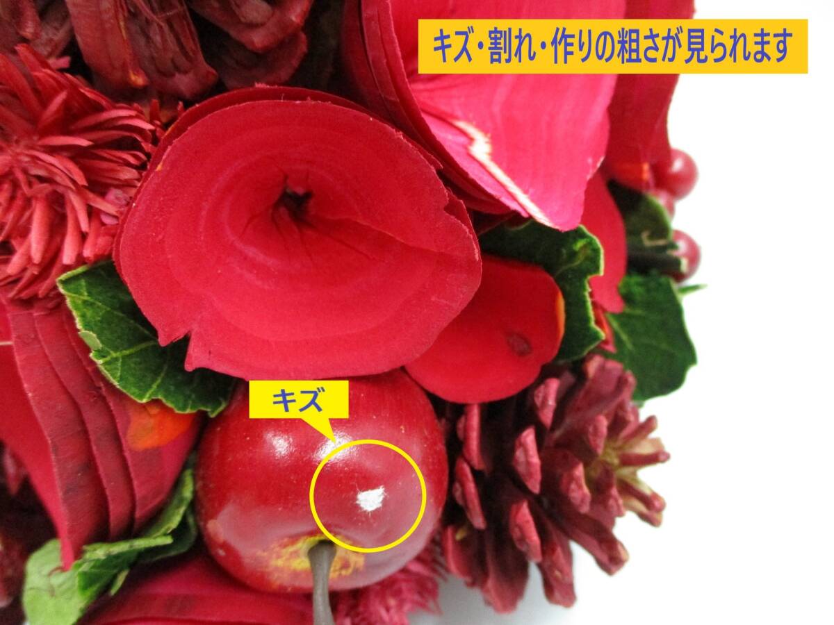 | 「訳あり」扱いの、未使用品。 倉庫での長期保存品です。 33cmというコンパクトなサイズながら 落ち着いた色合いで 人目をひくツリーです。 赤リンゴや松ぼっくり、 ベリーやお花があしらわれています。 主にドライした自然素材が使用されています。 おまけとして、リボンの飾りをお付けします。 お好みの場所にご使用下さい。 このまま飾っていただくのはもちろん、 ご自身でお好みにデコレーションして、 オリジナルのクリスマスツリーを 作っていただくのも楽しいと思います。 (参考:画像9) 自然素材のため、長期のご使用に伴い、 色あせ・材質変化等が生じる場合があります。 また、配送時の振動などにより、 造形の多少の崩れ・部品外れ・ 装飾に欠け等が生じる場合がありますが、 この点に関しましては 当方はサポートをいたしません。 あらかじめご了承下さい。 この点より「訳あり」として出品いたします。 以下の商品説明をよくご覧になってから、 ご検討をお願いいたします。 神経質な方、完品をご希望の方は、 御入札をご遠慮ください。 【商品内容】 可愛い 赤リンゴの クリスマス ツリー (オマケのリボン付き) [基本的な仕様] *個々のお品で多少の差異あり ・サイズ: 径17~18cm・高さ32~33cm程度 (装飾の付き方により多少の差異あり) *サイズ対比として 600mlペットボトル他 を置いています 参考にどうぞ(参考:画像7) ・重量: 500g程度 ・ツリーの主な素材: 木の実・樹皮・ドライフラワー *土台は 発泡スチロール等 *ドライした自然素材を主に使用し すべて1つずつ手作りしています ・その他: 海外製/メーカー等の詳細は不明 ライト等の装飾は付いておりません 装飾品の付き方によりましては、 台座が浮いた状態になっている 場合があります(参考:画像4) おまけのリボンの飾り付き(参考:画像8) ・備考: 商品配送時の振動・衝撃で 部品外れ等の破損が生じた場合は、 木工用ボンドや手芸用グルーガンで 簡単に修繕可能です *状態は、画像にてご確認ください *実際の商品の色味と異なる場合があります *記載の商品サイズは、 当方の定規にての大まかな寸法です 実際のサイズとは異なる場合があります *画像は 基本的には 今回お送りするお品を撮影していますが 画像9のみ撮影用を使用しています 【状態等】 ・未使用品です。 ・海外製のため、 装飾品の固定・接着剤の付着など、 全体的に作りに粗さがある場合があります。 (参考:画像5・6、他) ・装飾品に、キズ・欠け・凹み等がある 場合があります。 ・自然素材のため、長期のご使用に伴い、 色あせ・材質変化等が生じる場合があります。 また、配送時の振動などにより、 造形の多少の崩れ・部品外れ・ 装飾に欠け等が生じる場合がありますが、 この点に関しましては 当方はサポートをいたしません。 ・保管時に使用していた 防虫・殺虫剤の臭いがする場合があります。 苦手な方、気になさる方は、 風通しの良いところで 臭いを飛ばしていただくことをお勧めします。 ・紙・緩衝材で簡易的に保護し、 再利用箱に入れて発送をいたします。 (参考:発送状態・画像10) 以上の点より「訳あり」として出品いたします。 ご承知いただける方のみ、 ノークレーム・ノーリターンにてご検討下さい。 | ||