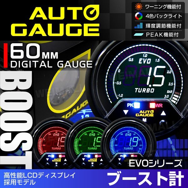 高性能LCDディスプレイ採用 オートゲージ プレミアム 456シリーズ EVO デジタルゲージ ブースト計 60mm 点灯色: ホワイト / レッド / グリーン / ブルー 4色LCD ピークホールド機能付 ワーニング機能付 輝度調節機能付(6段階) バックライトカラー切替機能付 |