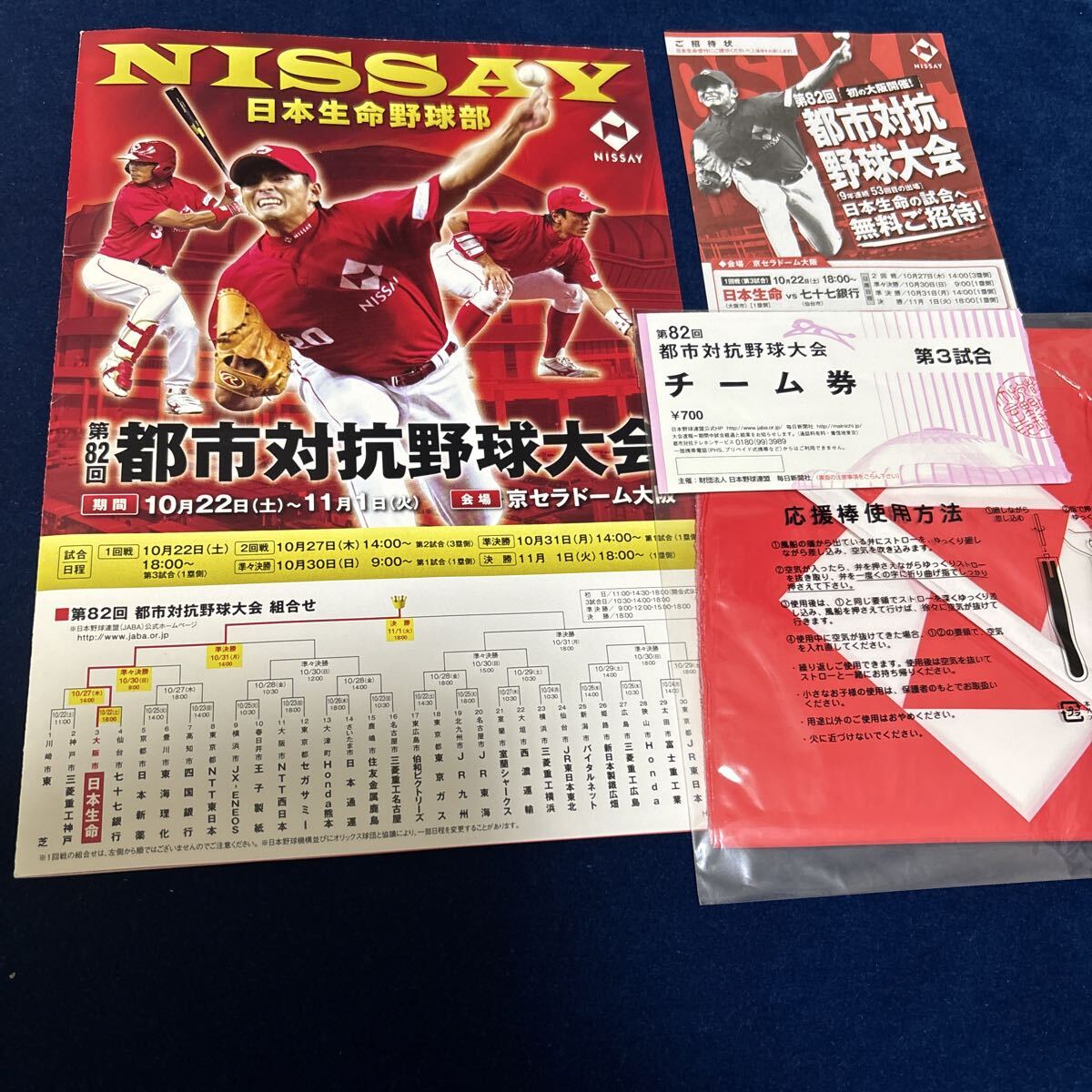 2011年開催の都市対抗野球、日本生命野球部のパンフレット、入場券、招待状、応援棒のセットです。| 出价者 | 信用 | 价格 | 时间 |