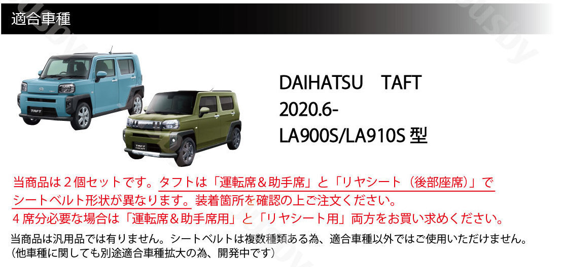 | ダイハツ タフト TAF 専用 本皮シートベルトカバー2個セットです 車種専用本革シートベルトカバー 2個セットです。タフト(LA900S/LA910S型)に装着可能です。 ステアリングやシフトノブと同様に乗車毎に必ず触れるシートベルトを本革にてカバーできます。 手触り・質感アップは勿論シートベルト収納時 のパネルへの傷つけ防止・カタカタ音防止にもなる為非常にオススメです。 カラーは 赤ステッチ・青ステッチ・黒ステッチ・オレンジステッチ・ダークブラウンの5種類からお選びいただけます (落札後は色変更出来かねます。商品タイトルの色をご確認ください) 当商品は2個セットです。 TAFTは「運転席&助手席」と「後部座席」でシートベルト形状が異なります。装着箇所を確認の上ご注文をお願いいたします。 4席分必要な場合は「運転席&助手席」&「後部座席」両方をお買い求めください。 当シートベルトは汎用品では有りません。 シートベルトサイズは数多くの種類がある為適合車種以外ではご使用いただけません。 平縫いとクロスステッチを使用して縫い上げを行い、2種類の糸を使用して強度とデザインにこだわった商品です。 シートベルトの装着・取外し時など触れる毎に本革レザーの上品な質感を感じていただけます。 取付方法は簡単な付属両面テープでの固定または、付属糸で確実な装着&見た目もアップする手縫いによる固定の2種類があります。 お好みの方法で装着してご使用ください。 ( ・∀・)Φスタッフレビュー 通常はプラスチック剥き出しで冷たいシートベルト部分が当商品で一新します。厚みもアップして手触り・見た目の高級感もアップします。 ピラーなどに当たってカタカタ音がなっていたりする事もなくなりました。乗車毎に触れる部分なので装着後の満足度は非常に高くおすすめです♪ |