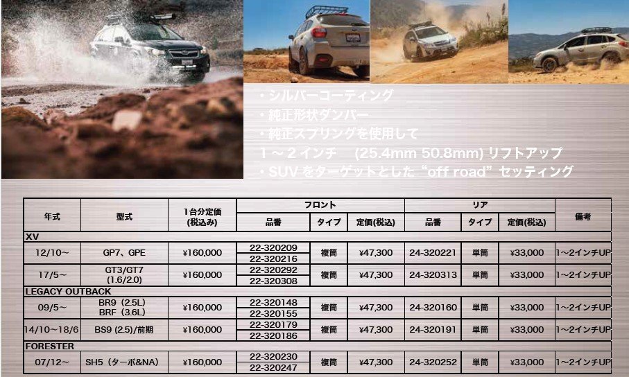 Off-Road Capability, On-Road Comfort. オフロード走行性、オンロードでの快適性を実現 ・シルバーコーティング ・純正形状ダンパー ・純正スプリングを使用して1 ~ 2 インチ (25.4mm 50.8mm) リフトアップ ・SUV をターゲットとした“off road”セッティング 車両安定性がはるかにUPいたします。 乗り心地も快適で安心感を約束いたします。 |