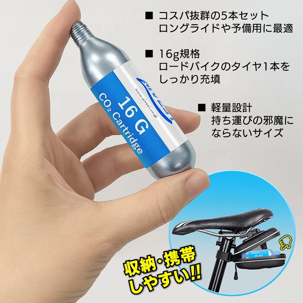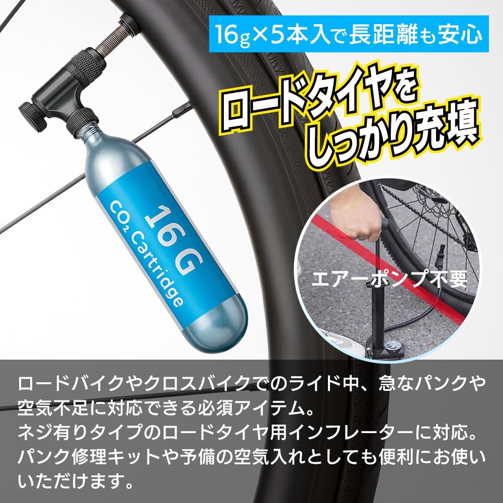 | ロードタイヤを一瞬でしっかり充填 16g×5本入りで長距離も安心 |