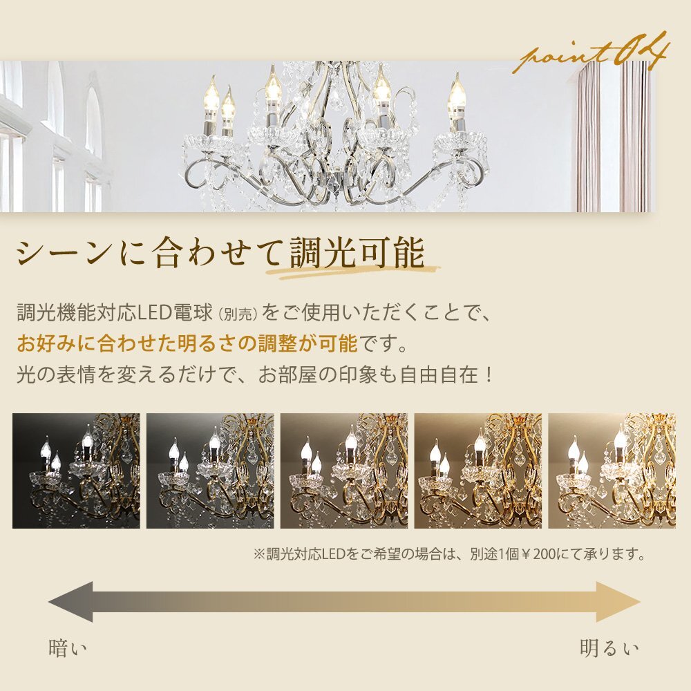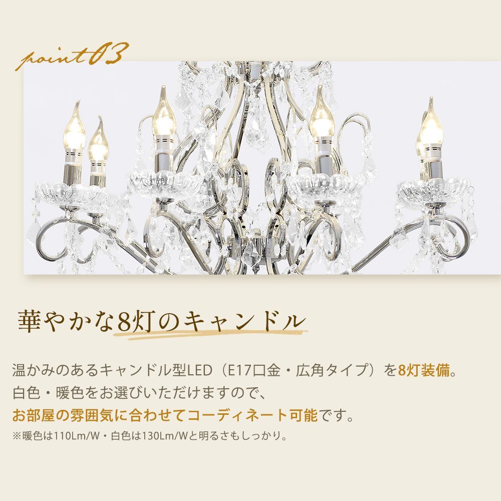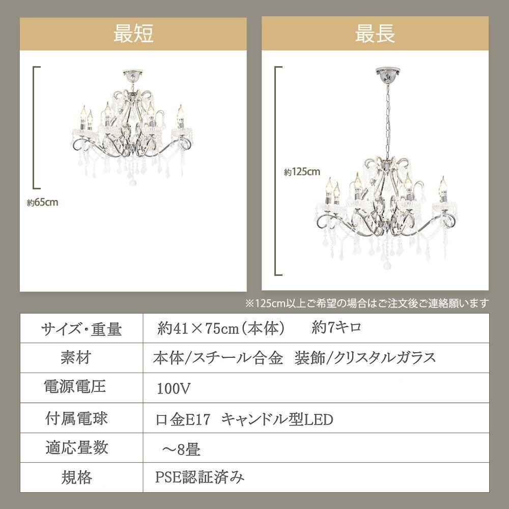 | 商品説明 | ![]() ☆LED電球サービスキャンペーン開催中!☆【送料無料!】★超激安即決!★新品 キャンドル8灯クリスタルシャンデリア♪ ●キャンペーン期間中 広角LED電球8灯(¥9600-相当)お付けいたしまして驚きのプライス! ☆LED電球サービスキャンペーン開催中!☆ ※通常電球別売の為、価格記載の電球画像掲載がございますがキャンペーン期間中は無償提供(調光別途¥200-)させて頂いております※ ☆上質水晶ならではの最高の輝きを放つ新品クリスタルシャンデリア ☆添付画像では肉眼で見る本来のクリスタルの輝きをご確認いただけませんが、8灯の電球が上質クリスタル水晶を通し光の屈折で光の持つ本来のカラーをかもし出しダイヤモンドのように輝きながらワット数以上の明るさでお部屋を照らします ☆スタイルは飽きの来ないシンプルなデザインです♪ ☆とても明るくおしゃれなシャンデリアです ☆シャンデリア本体は調光にも対応しており、お好みの明るさに調整可能です ※調光が必要の場合、調光対応LED1個別途¥200-と汎用調光器が必要です ☆付属電球・・・口金E17広角LED暖色6灯(明るさ40ワット消費電力4ワット 暖色36Lm/W・白色40Lm/W) ※調光対応LED1個別途¥200- ※白色LEDご希望の場合はご注文後お申し付けください 商品画像は暖色LEDを装着し撮影しております ☆取り付けに関しましてはワンタッチでは御座いませんが(配線はワンタッチ)引掛けシーリングに対応しております ☆リビング等に最適なゴージャスクリスタルシャンデリアを是非この機会に! ☆サイズ・高さ(天井よりシャンデリア本体底辺)約55~125cm調整可能 直径約75cm 重量約7キロです ※125センチ以上必要の場合はご注文後お申し付けください ![]() |